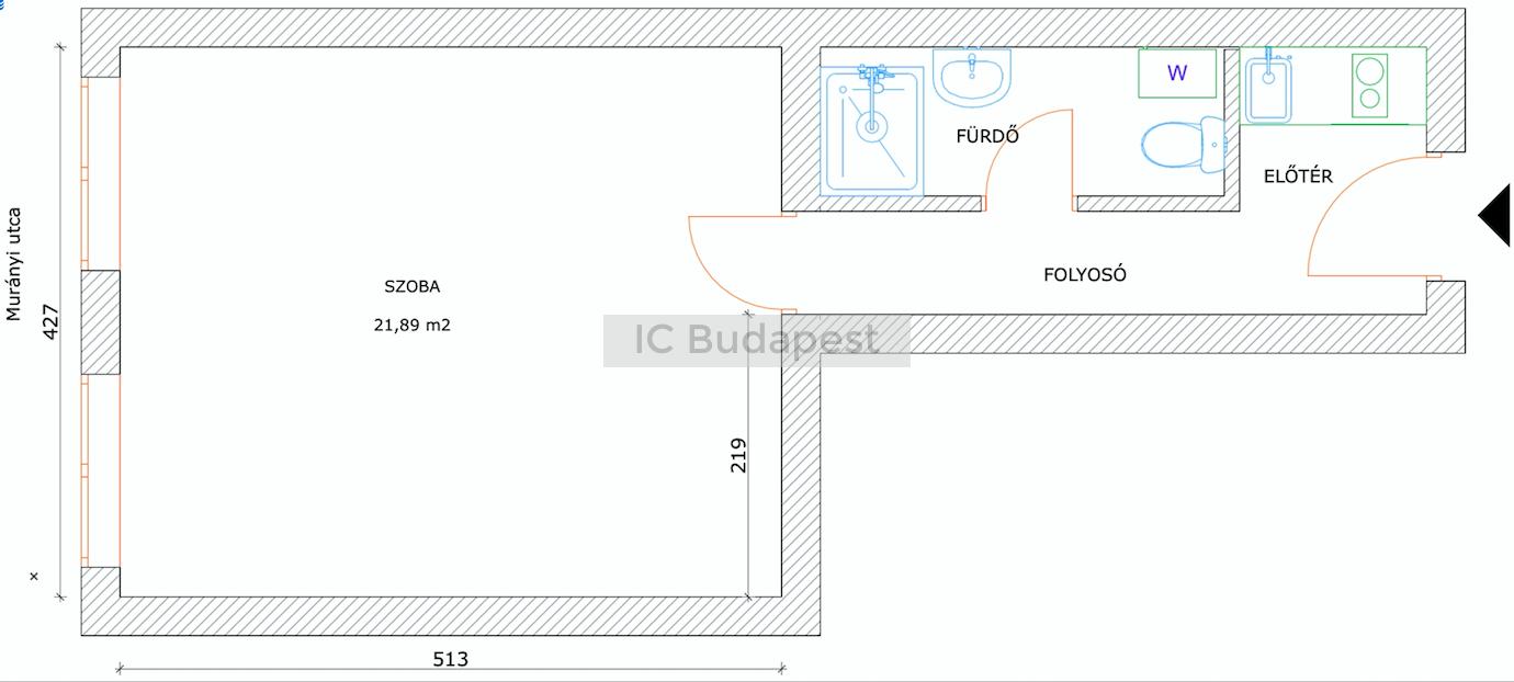 Budapest VI. kerületében, a Murányi utca Damjanich utcához közeli szakaszán eladó egy 3. emeleti, 30 m2-es lakás. A társasház homlokzata átlagos állapotú, a belső udvar rendezett, tiszta. A lakás 3. emeleti, utcára néző ablakokkal rendelkezik. A konyhája kicsi, közvetlen a bejárat után helyezkedik el. A fürdőszoba tusolós kialakítású, a meleg vizet villanybojler szolgáltatja. Itt kapott helyet a mosógép is. A tágas, világos, 22 m2-es szoba 2 ablakkal az utcára néz, laminált parketta burkolatú. A fűtés konvektoros.