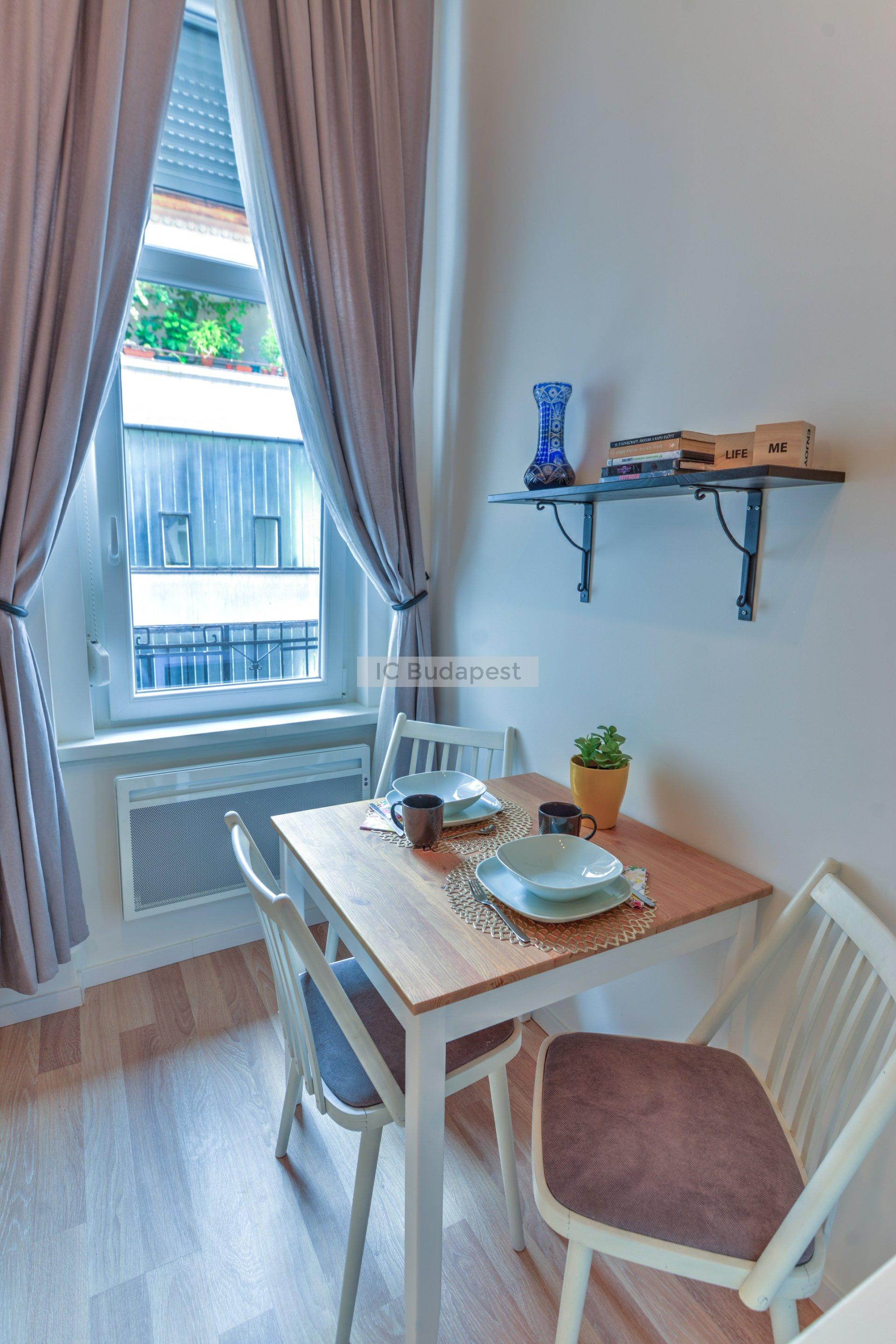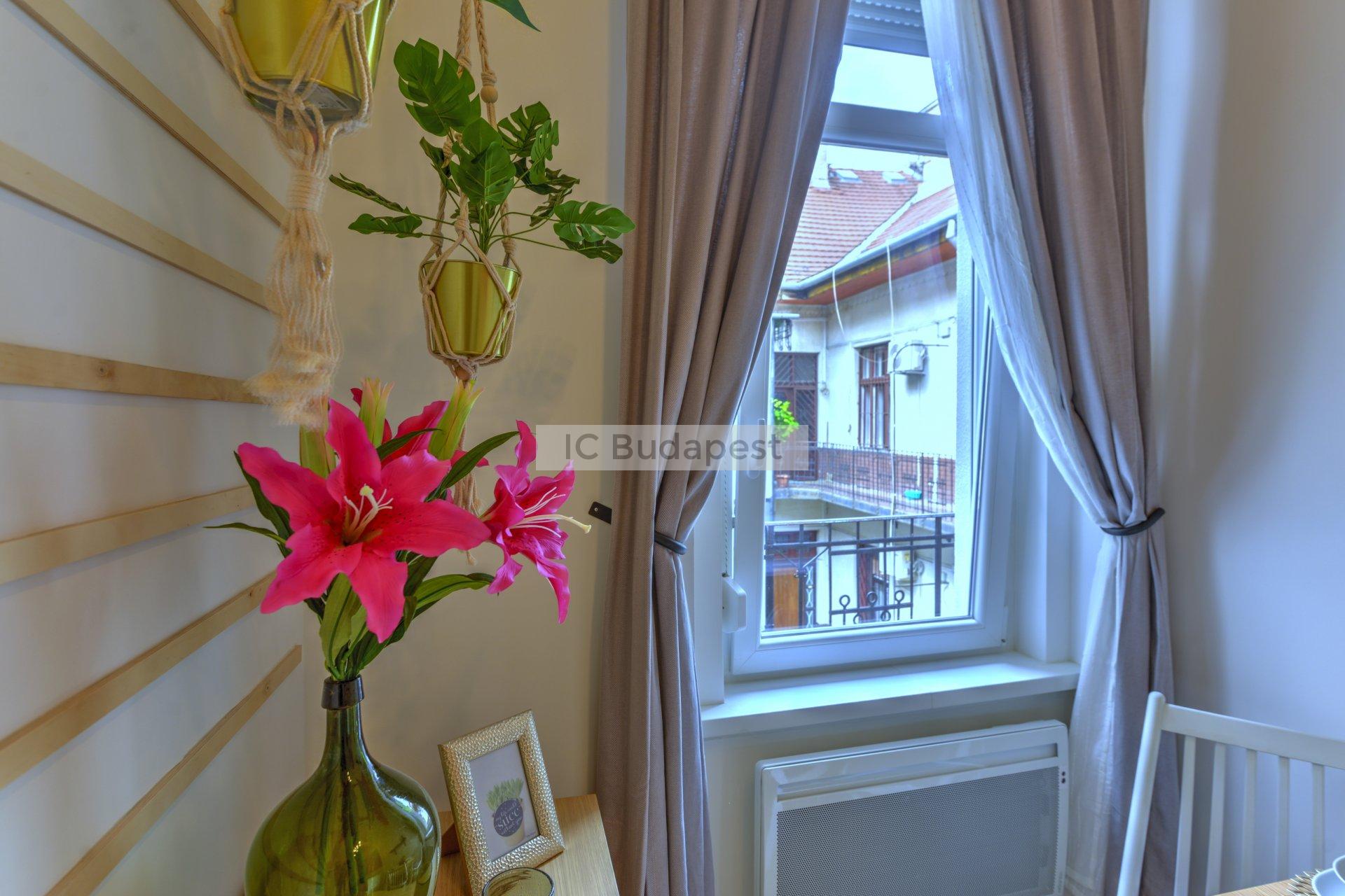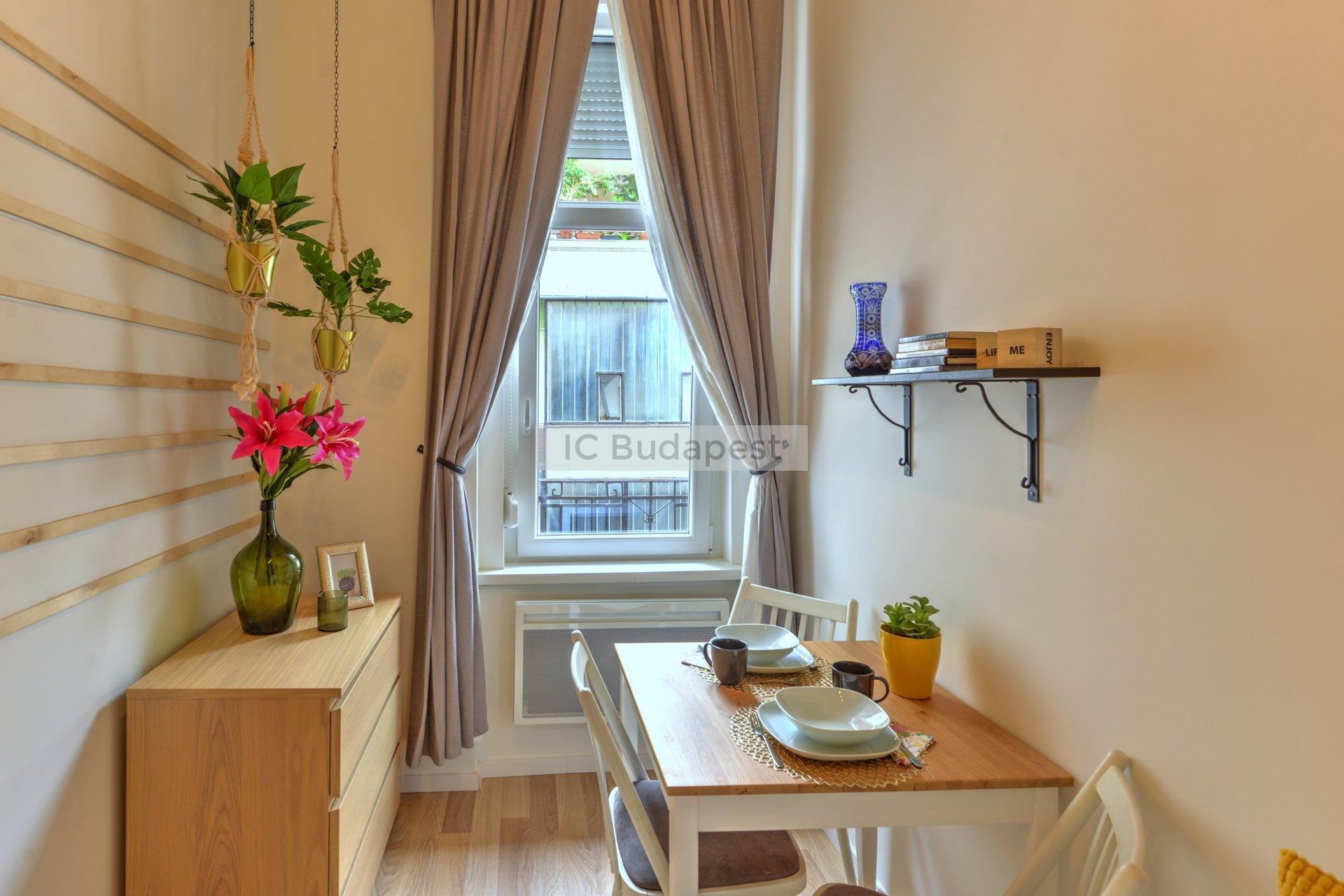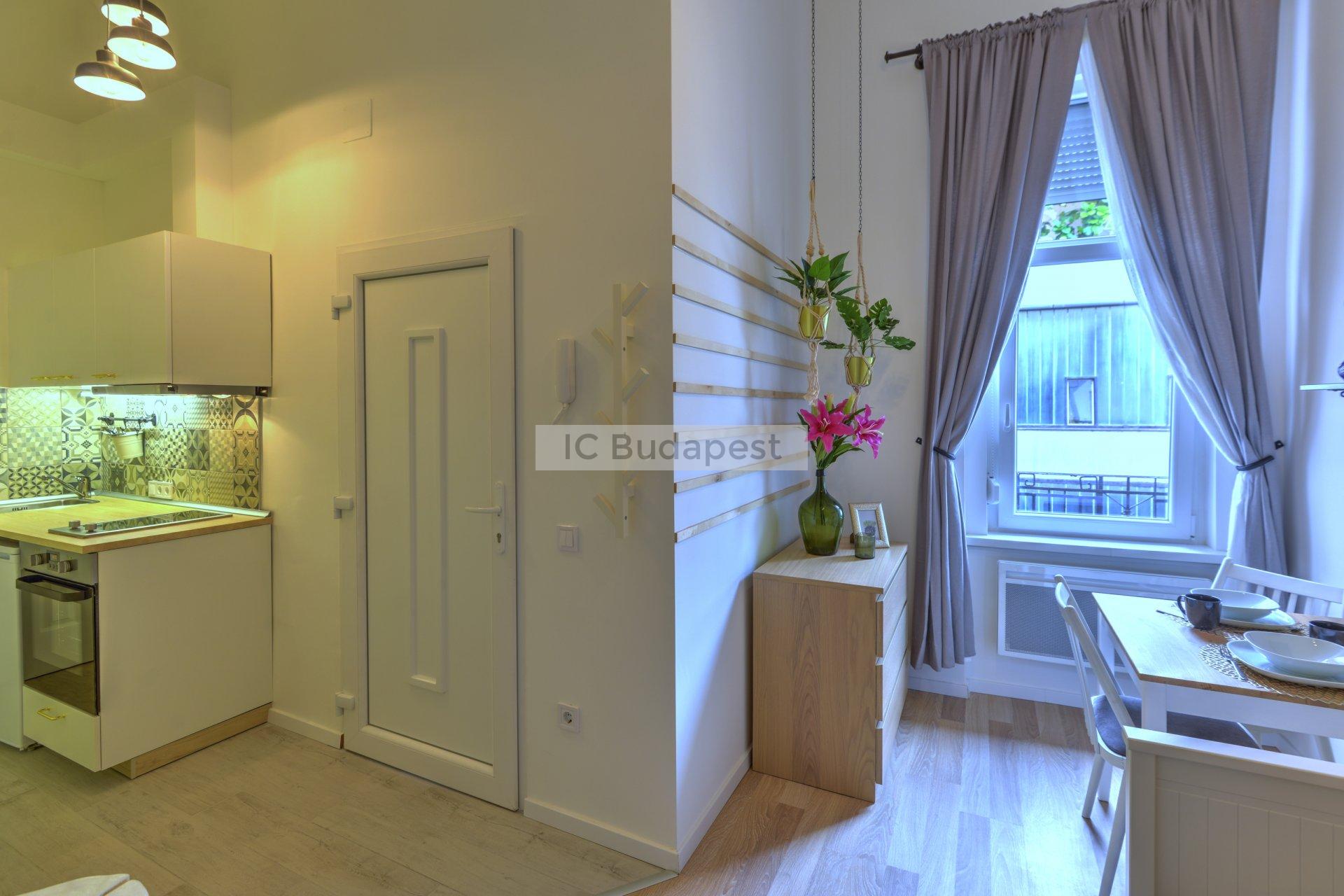 Budapest VI. kerületében, a Vörösmarty utcában, rendezett, jó állapotú társasház 3. emeleti, 22 m2-es garzonlakása kiadó. A társasház jó lakóközösségű, csendes. A lakás egy lakószobából, optikailag szeparált konyhából, tusolós fürdőszobából és szeparált WC helyiségekből áll. Nyílászárói újak, műanyagok, az ablakon redőnnyel. A konyha felszerelt, gépesített. A pici fürdőszoba tusolós kialakítású. A WC szeparált, itt kapott helyet a mosógép is. A lakás összes bútorzata új, igényes, fiatalos, még senki által nem lakott. Praktikus kialakításának köszönhetően kis alapterülete ellenére igazán élhető otthona lehet egy egyedülállónak vagy akár egy párnak is. A bérleti díj 350EURO/hó.
