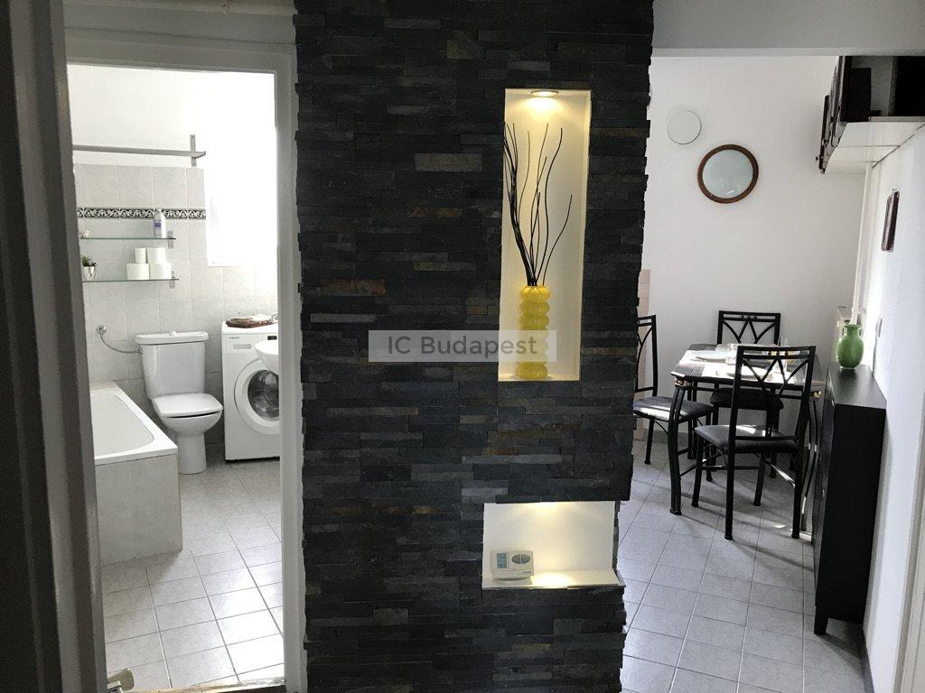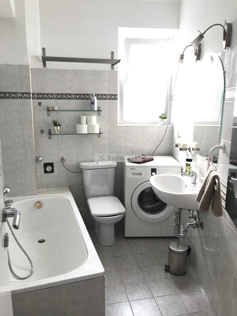 Két különbejáratú szobája jól elszeparált, a konyha külön helyiségben van, a fürdőszoba kádas kialakítású, itt találjuk a mosógépet is. Az előszobából nyíló bepolcozott kamrában van a hűtőszekrény.