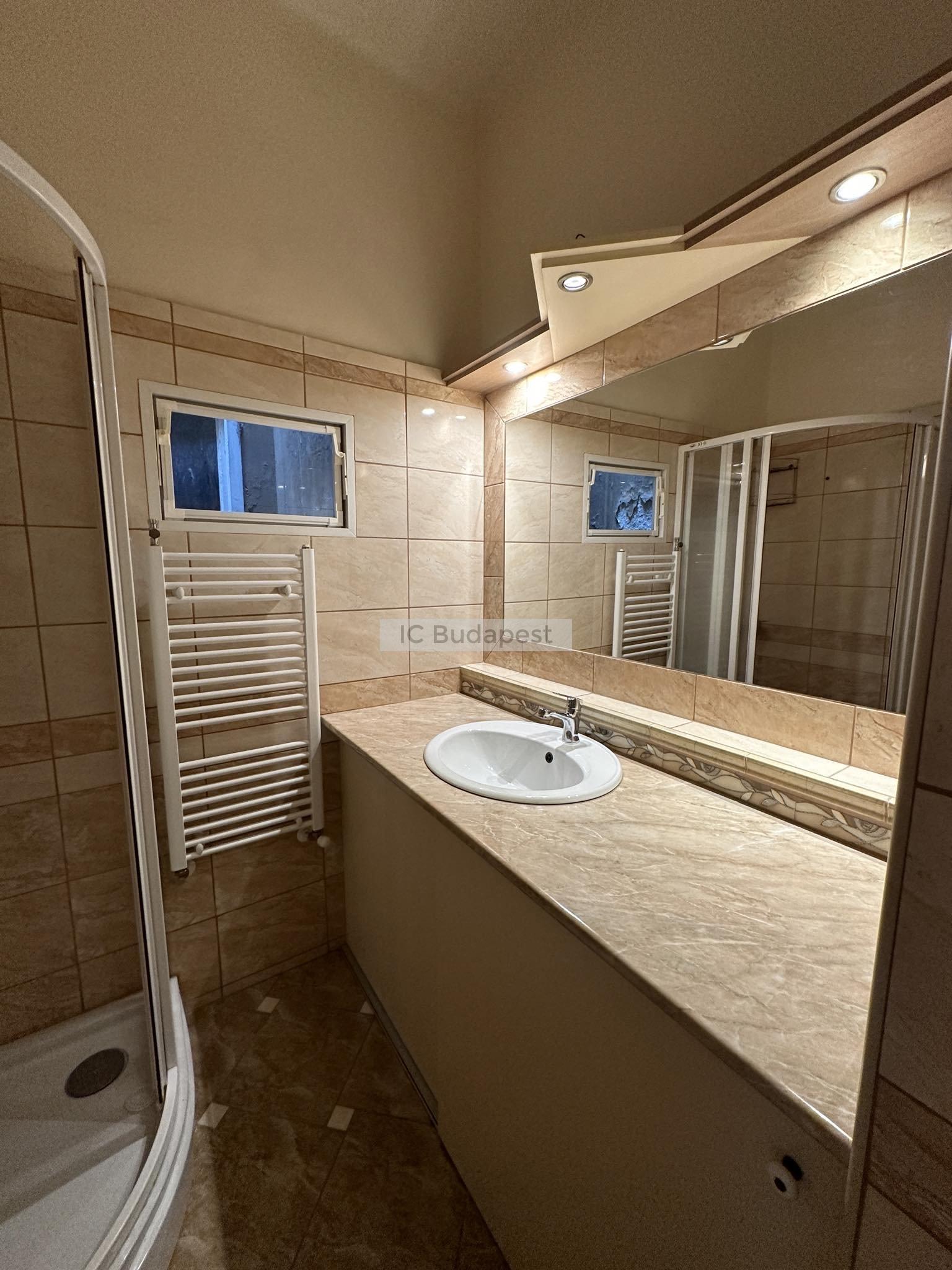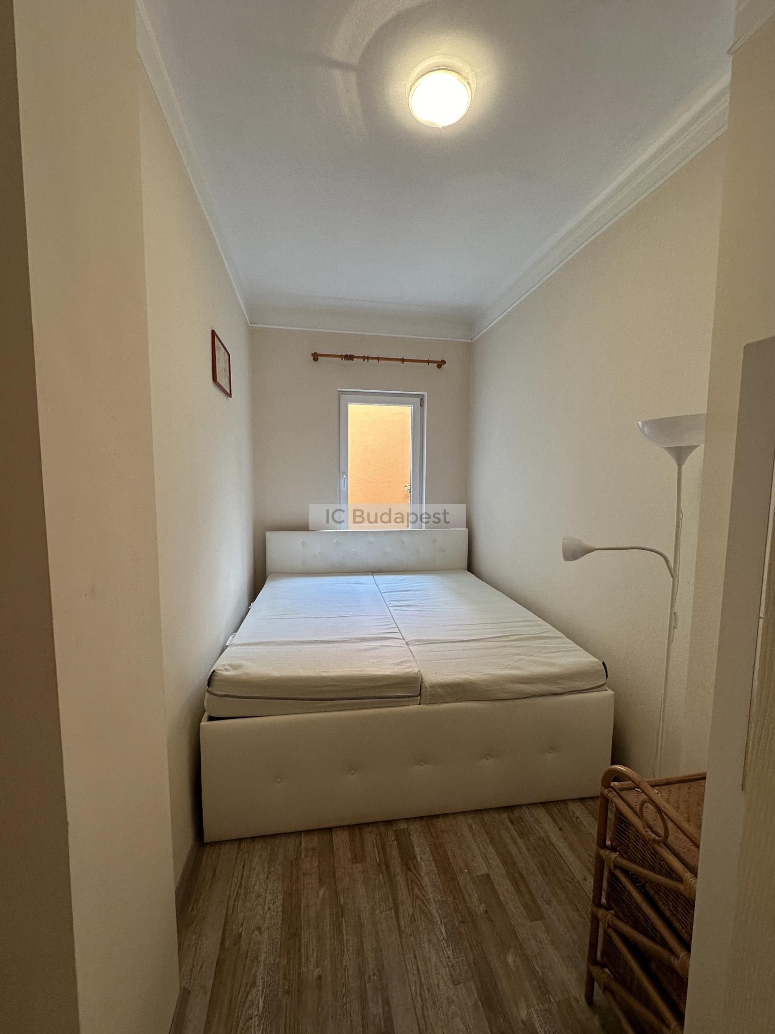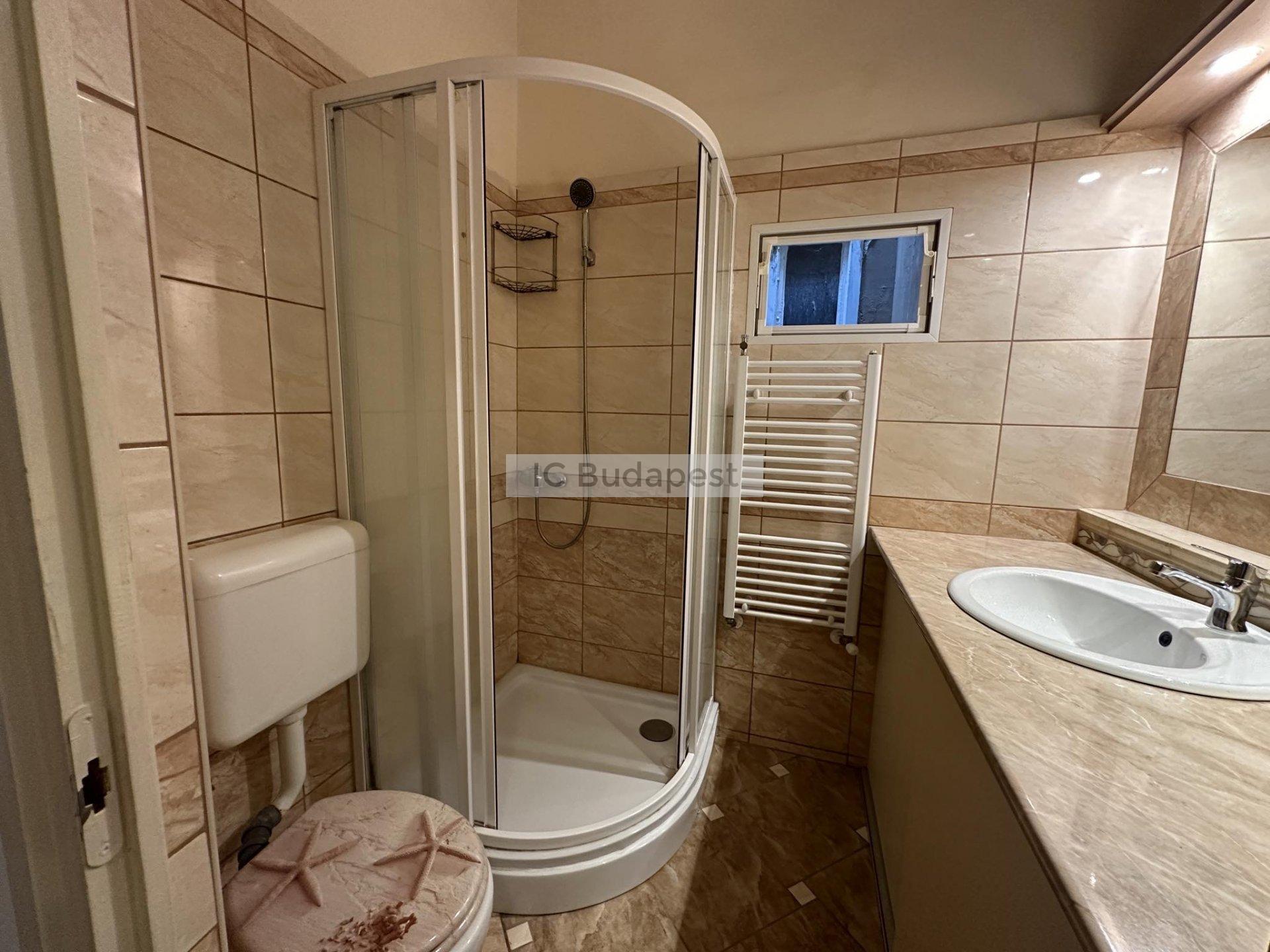 A hálószoba a csendes udvar felé néz, franciaágyas. A fürdőszoba tusolós kialakítású, a WC is itt kapott helyet, a mosógép is itt van.