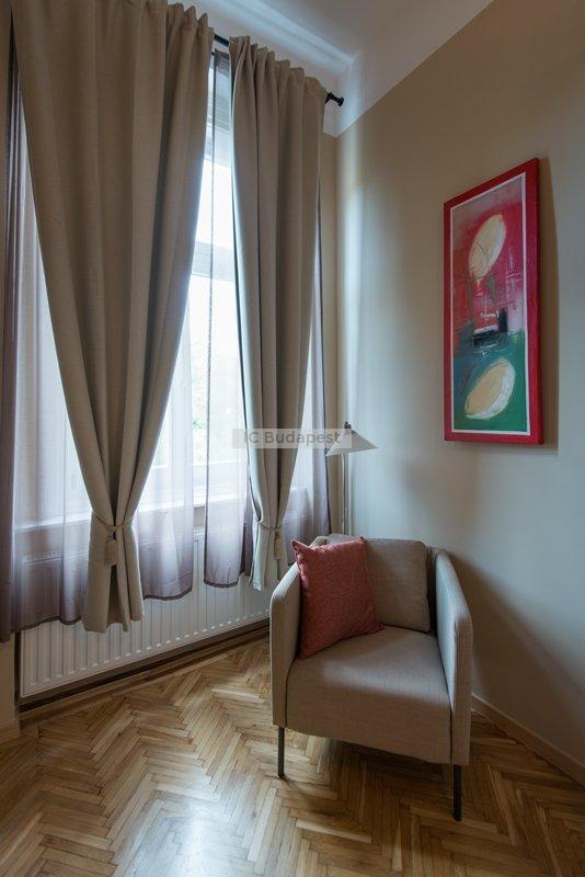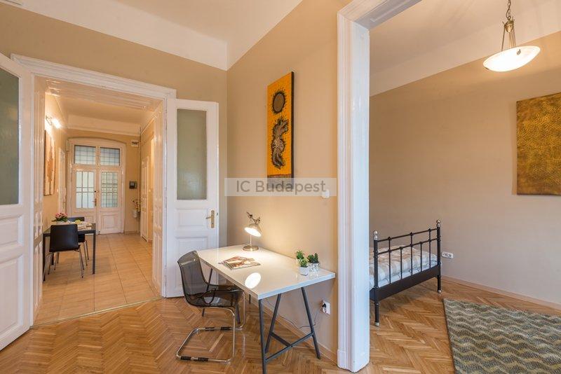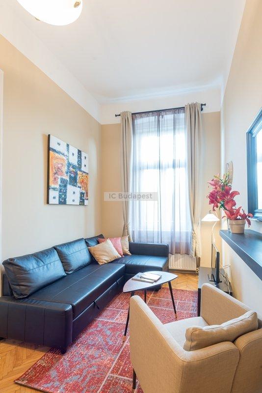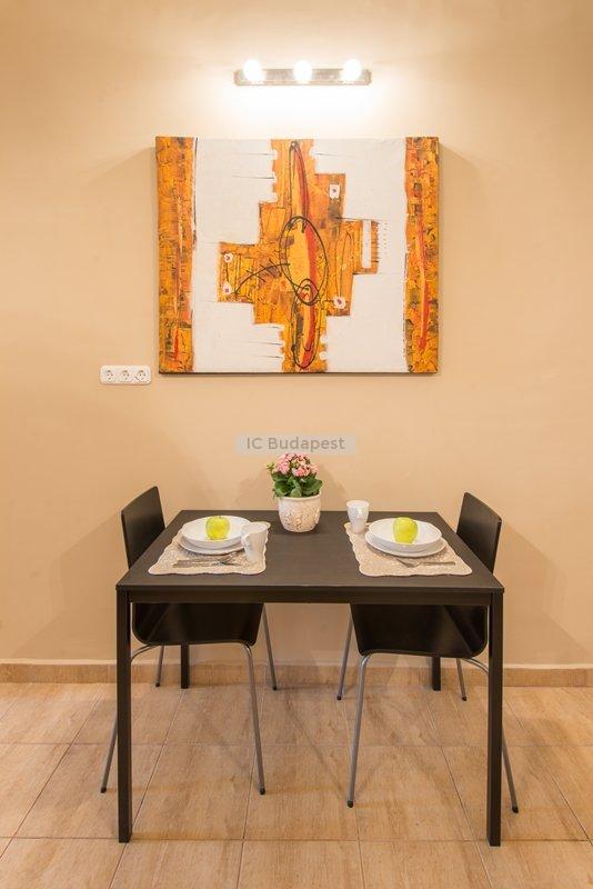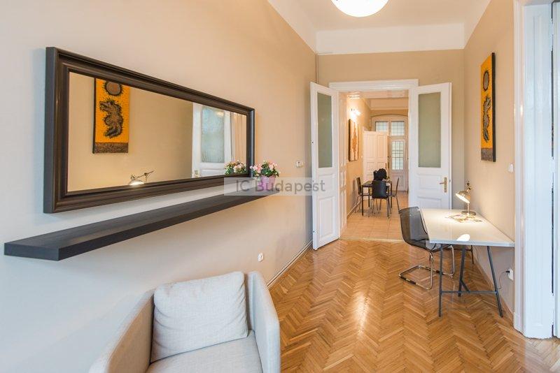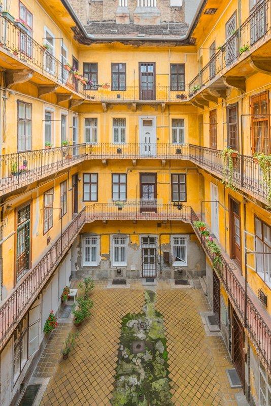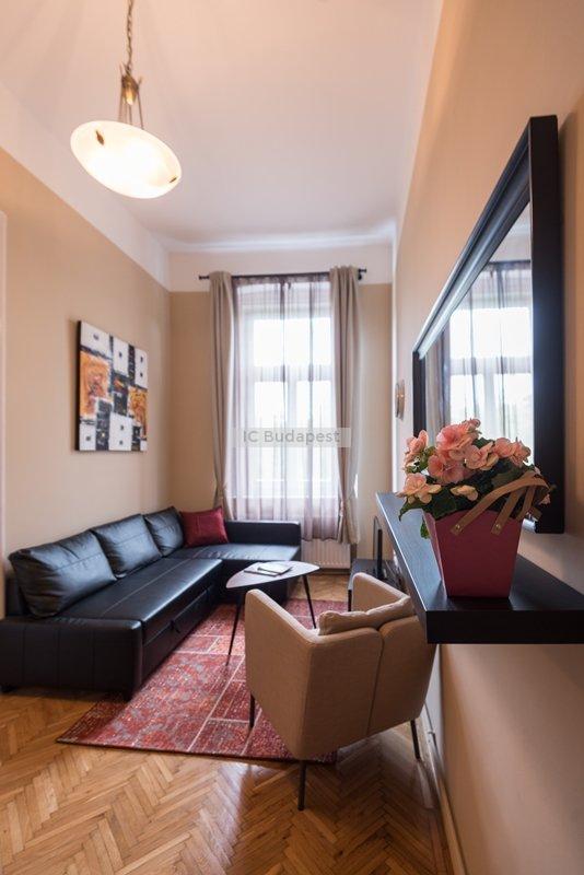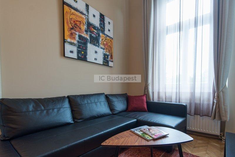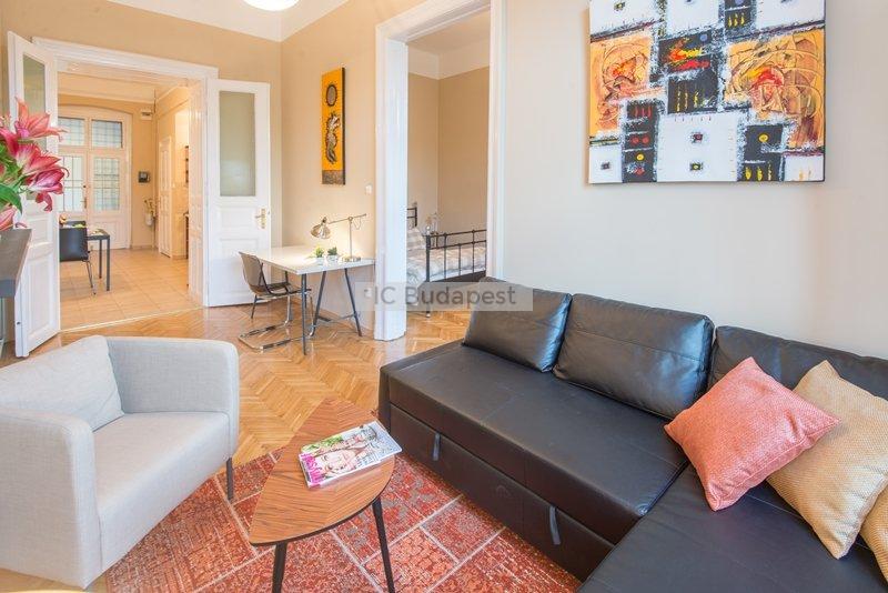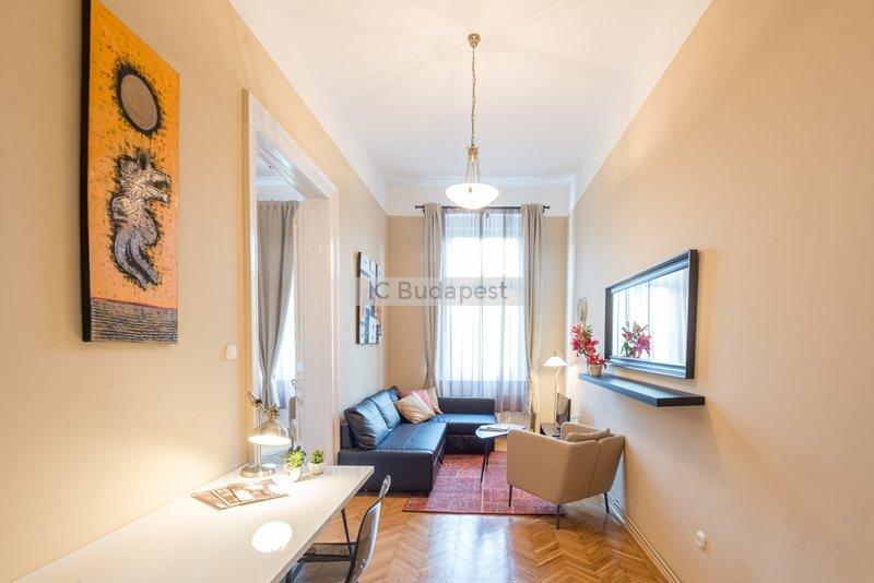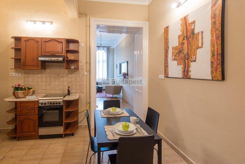 Budapest egyik forgalmas csomópontjához közel, a VI. kerületben, a Hunyadi téren kiadó egy 65 m2-es, nappali plusz kettő szobás, nemrégiben felújított és bútorozott lakás. A lakás egy három emeletes, rendezett társasház második emeletén található. A lakás a belső lépcsőházból nyílik. Előteréből a konyhahát tudjuk megközleíteni, ami teljesen felszerelt. Nagyméretű hűtőszekrény áll a lakók rendelkezésére. Nappalija tágas, kényelmes ülőgarnitúrával, dolgozó sarokkal. Innen nyílik az egyik hálószoba, melyben franciaágy van. A kisebbik szoba galériás. A fürdőszobában kád található. A lakásban cirkófűtés üzemel, minden mérőóra egyedi.