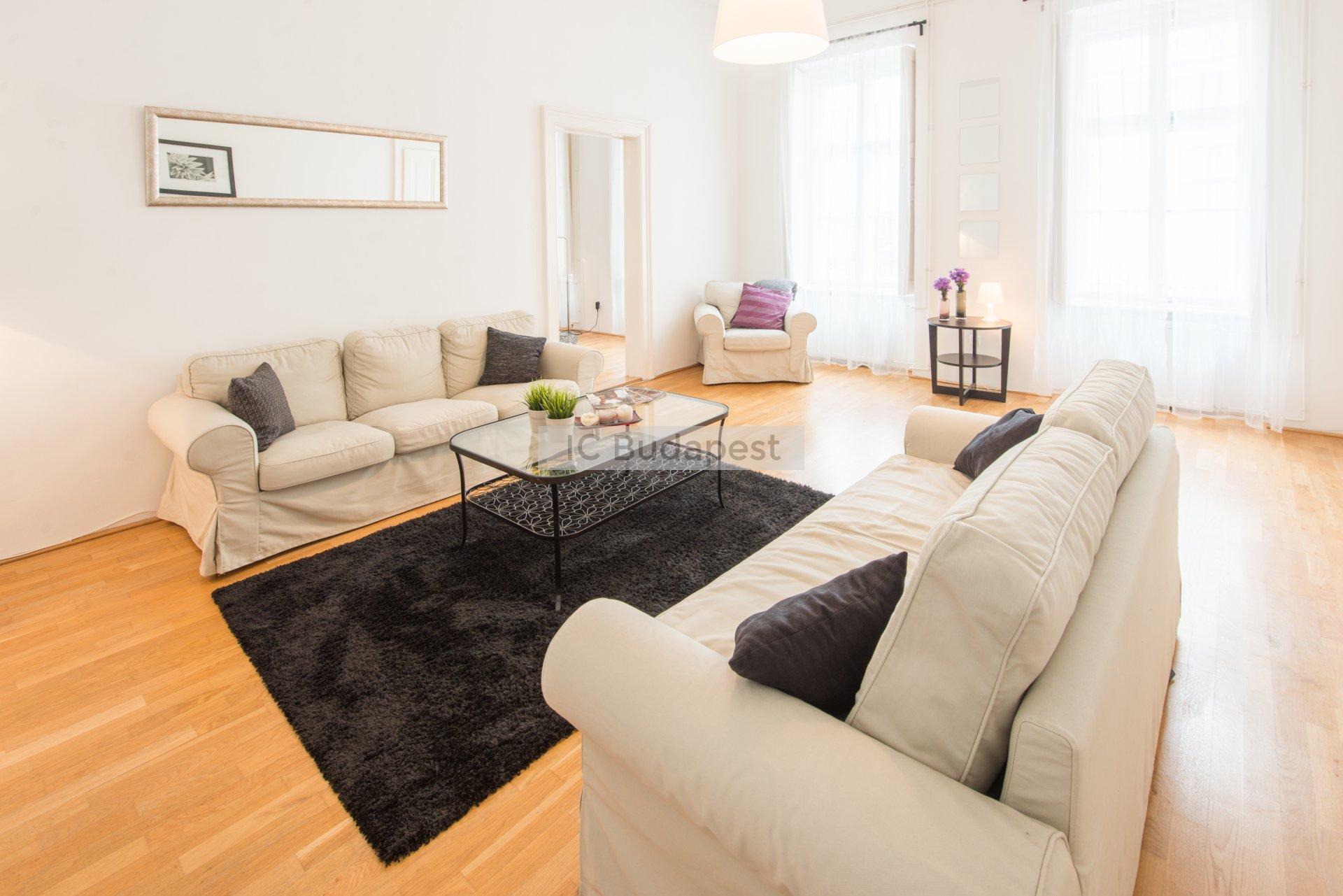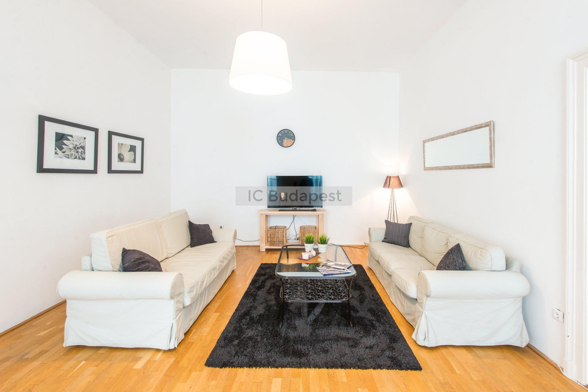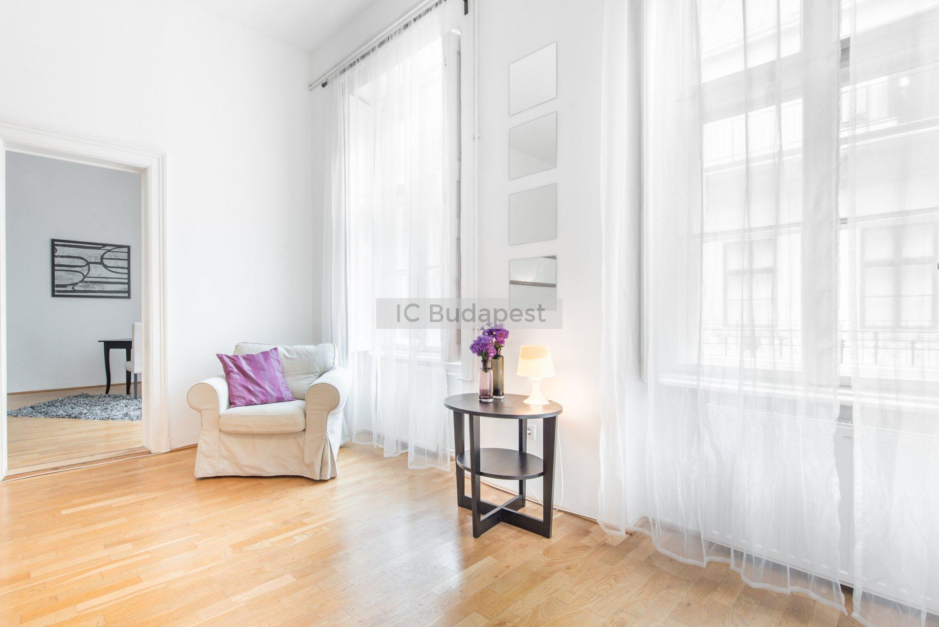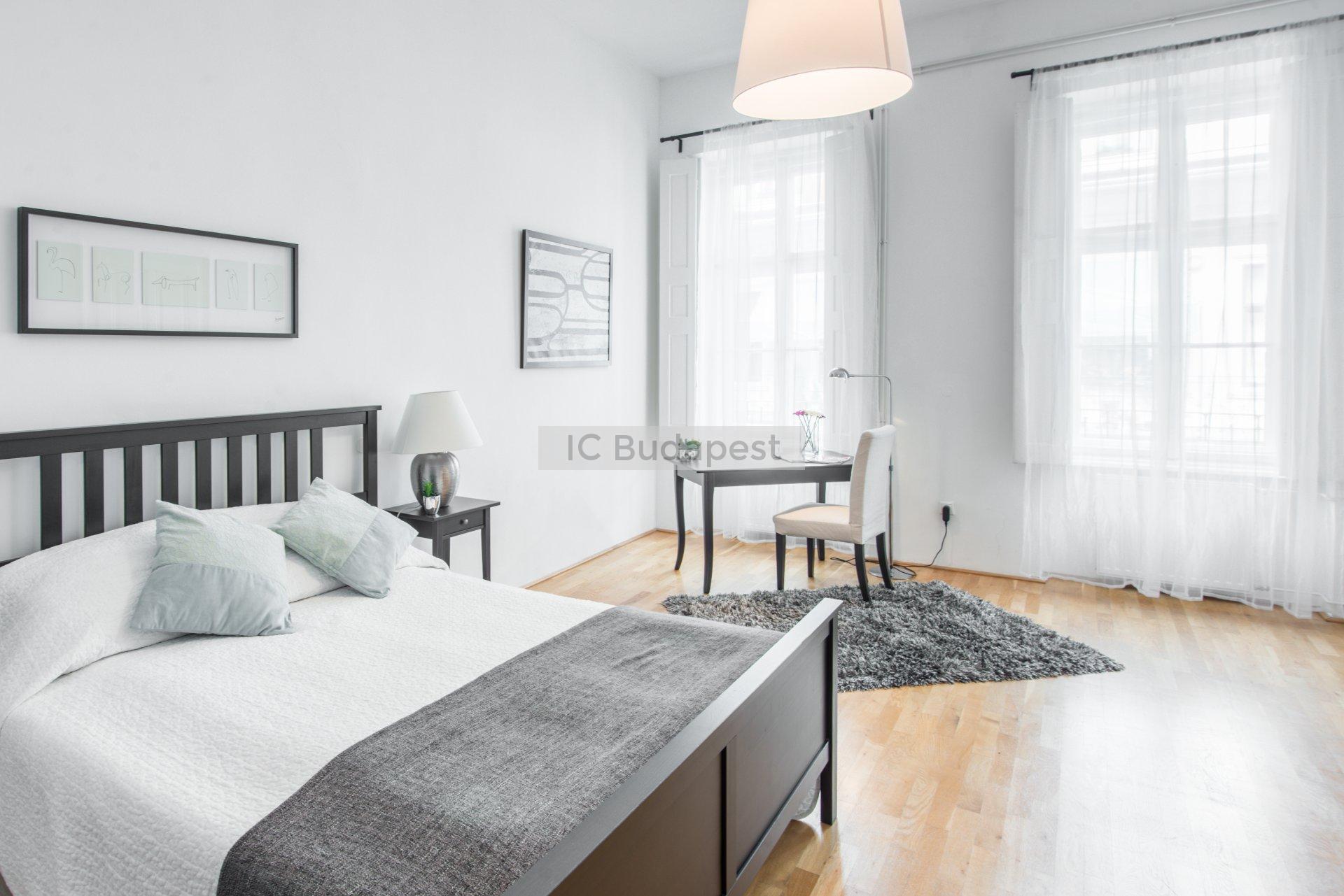 Budapest belvárosában, a népszerű Gozsdu udvar szomszédságában kiadó egy felújított, bútorozott, nappali plusz kettő szobás, 84 m2-es polgári lakás liftes házban. A lakás teljesen felújított, cirkó fűtéses. A lakás hatalmas ablakai az udvarra néznek, ám 3. emeleti elhelyezkedésének köszönhetően igazán világos. Berendezése modern, tágas konyhájában egy étkezőasztal székekkel is helyet kapott. A nappali tágas, világos, kényelmes ülőgarnitúrával, fotelekkel berendezett. Szobái franciaággyal felszereltek. A bérleti díj 700EURO/hó.