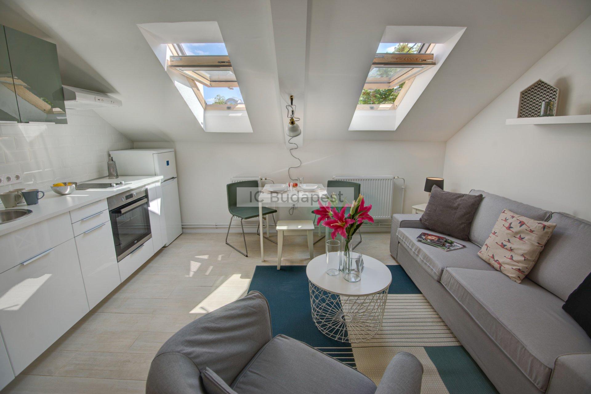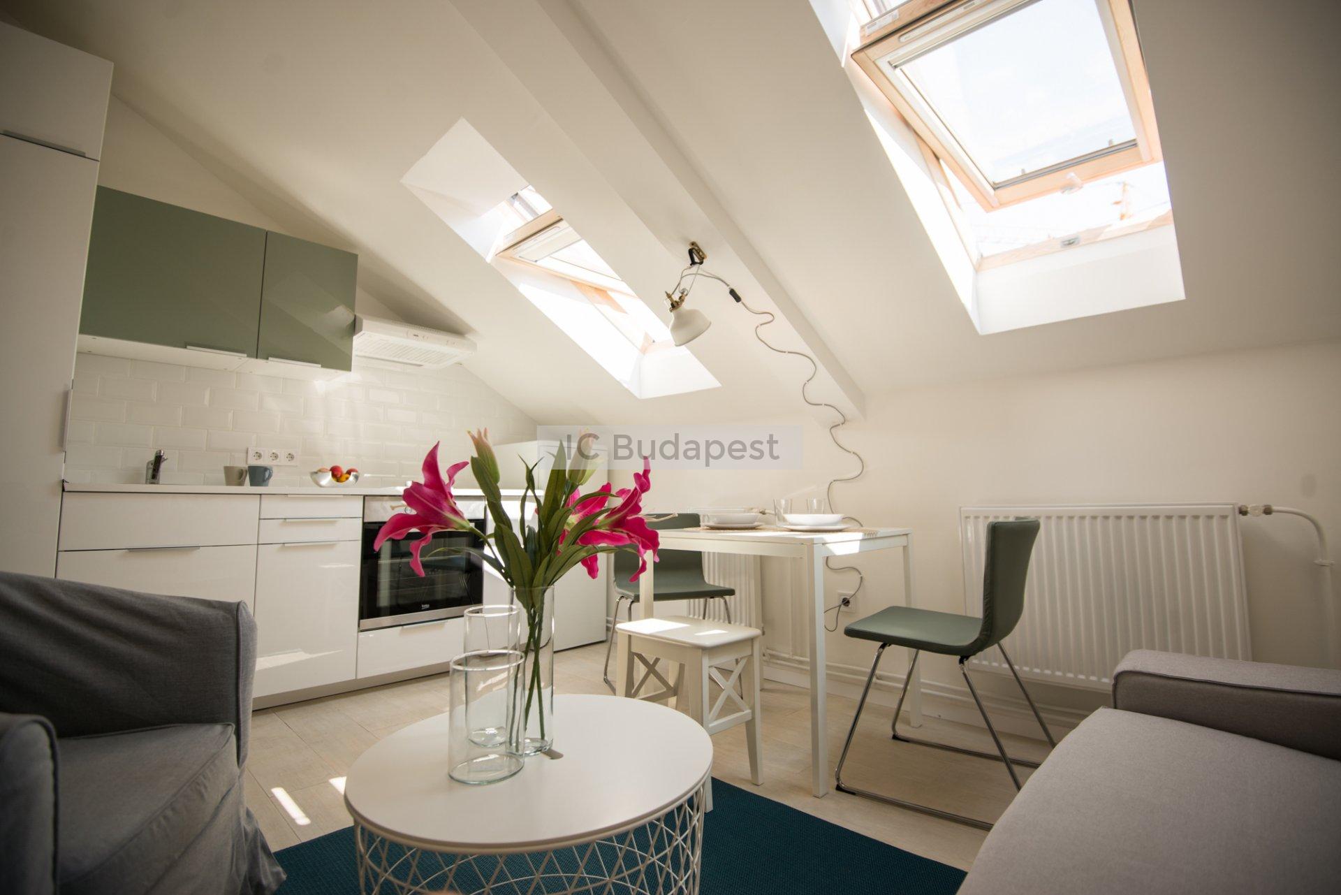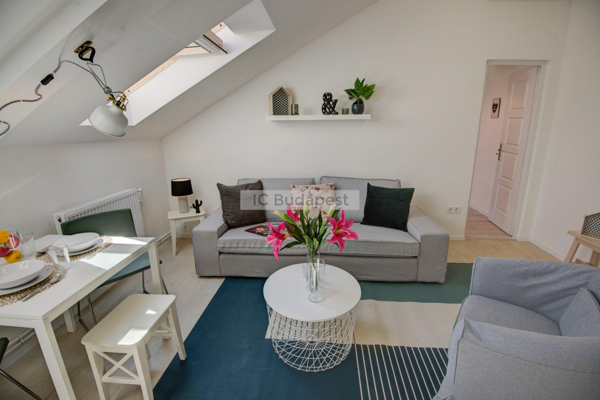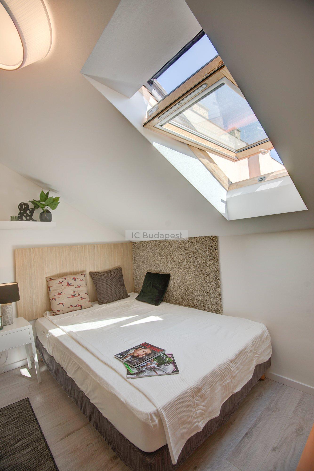 Budapest belvárosában, a Paulay Ede utca Deák tér felőli végén kiadó egy bruttó 52 m2-es, nappali plusz két külön bejáratú hálószobával rendelkező, frissen felújított lakás. A ház rendezett, az ötödik emelet lifttel is elérhető.  A lakás tetőtéri és déli fekvésű, melyeknek köszönhetően nagyon világos. A nyílászárók is ki lettek cserélve a felújítás során, a tetőtéri ablakok fénystoppos árnyékolóval ellátottak. A lakásba belépve az amerikai konyhás nappaliba jutunk, a hálószobák jobbra és balra találhatóak. A nappali jó hangulatú, tágas, világos, kanapéval, étkező asztallal berendezett. A fürdőszoba kádas kialakítású, a mosógép is itt található.