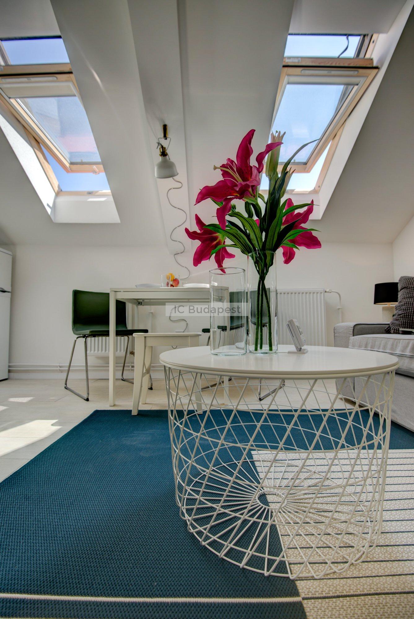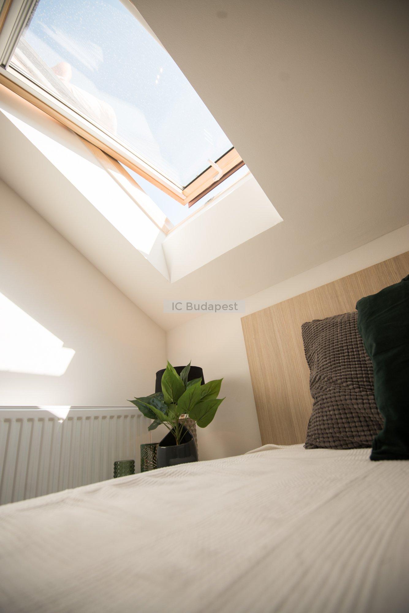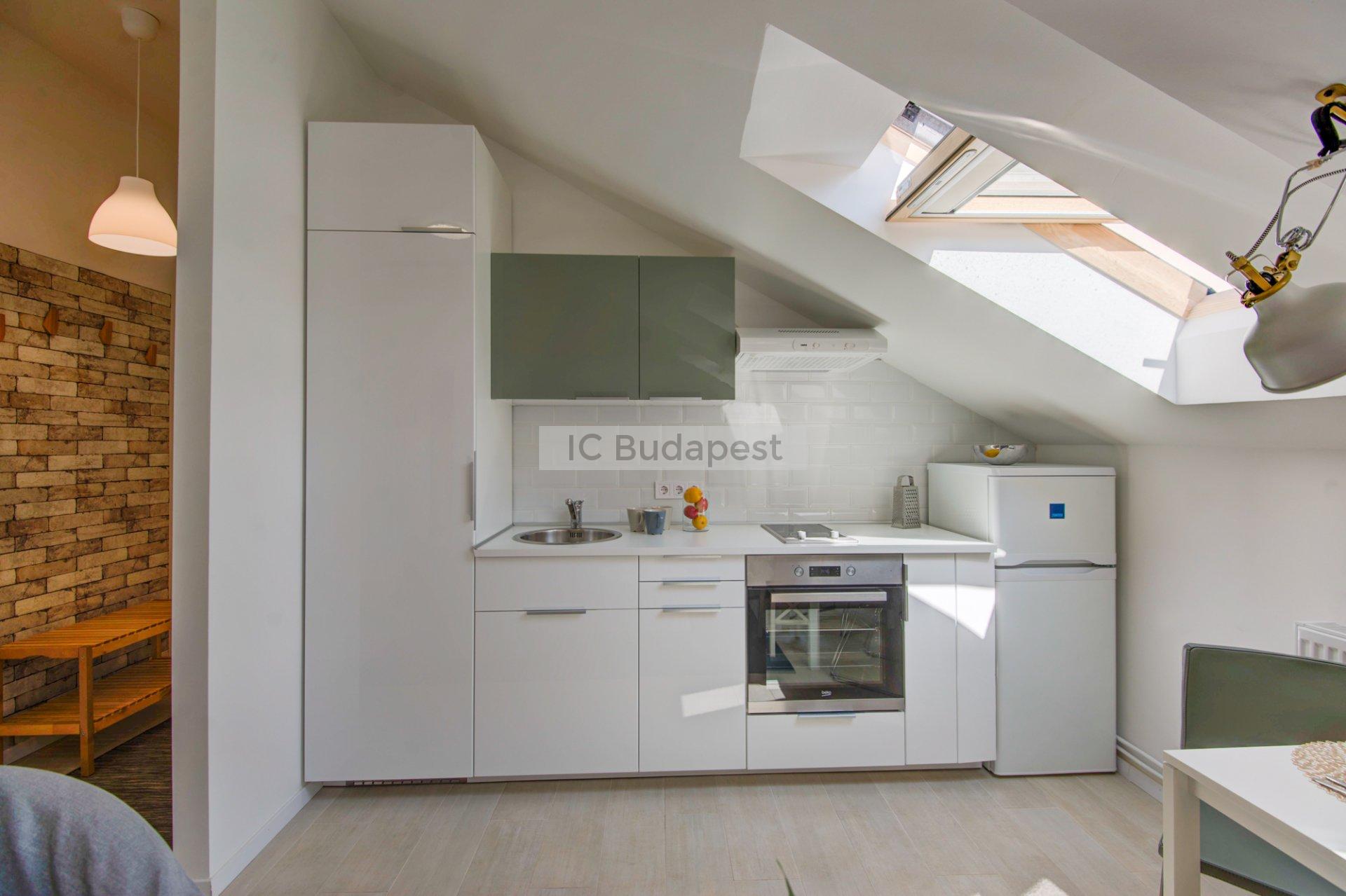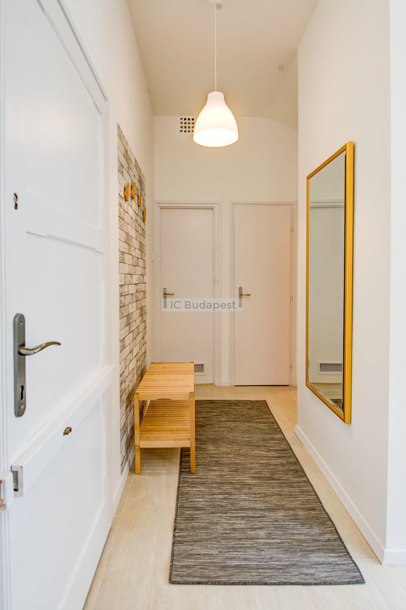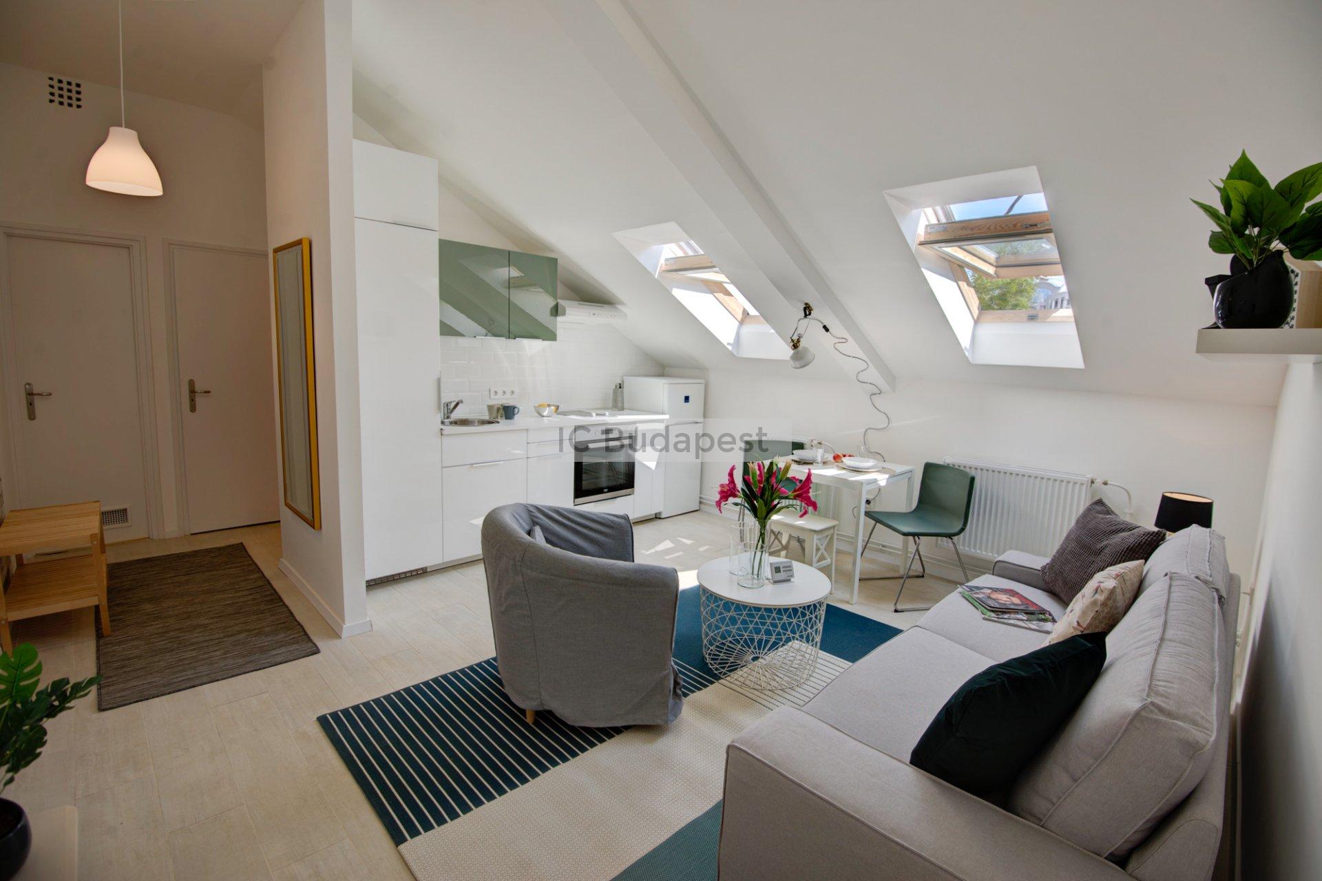 Budapest belvárosában, a Paulay Ede utca Deák tér felőli végén kiadó egy bruttó 52 m2-es, nappali plusz két külön bejáratú hálószobával rendelkező, frissen felújított lakás. A ház rendezett, az ötödik emelet lifttel is elérhető.  A lakás tetőtéri és déli fekvésű, melyeknek köszönhetően nagyon világos. A nyílászárók is ki lettek cserélve a felújítás során, a tetőtéri ablakok fénystoppos árnyékolóval ellátottak. A lakásba belépve az amerikai konyhás nappaliba jutunk, a hálószobák jobbra és balra találhatóak. A nappali jó hangulatú, tágas, világos, kanapéval, étkező asztallal berendezett. A fürdőszoba kádas kialakítású, a mosógép is itt található.