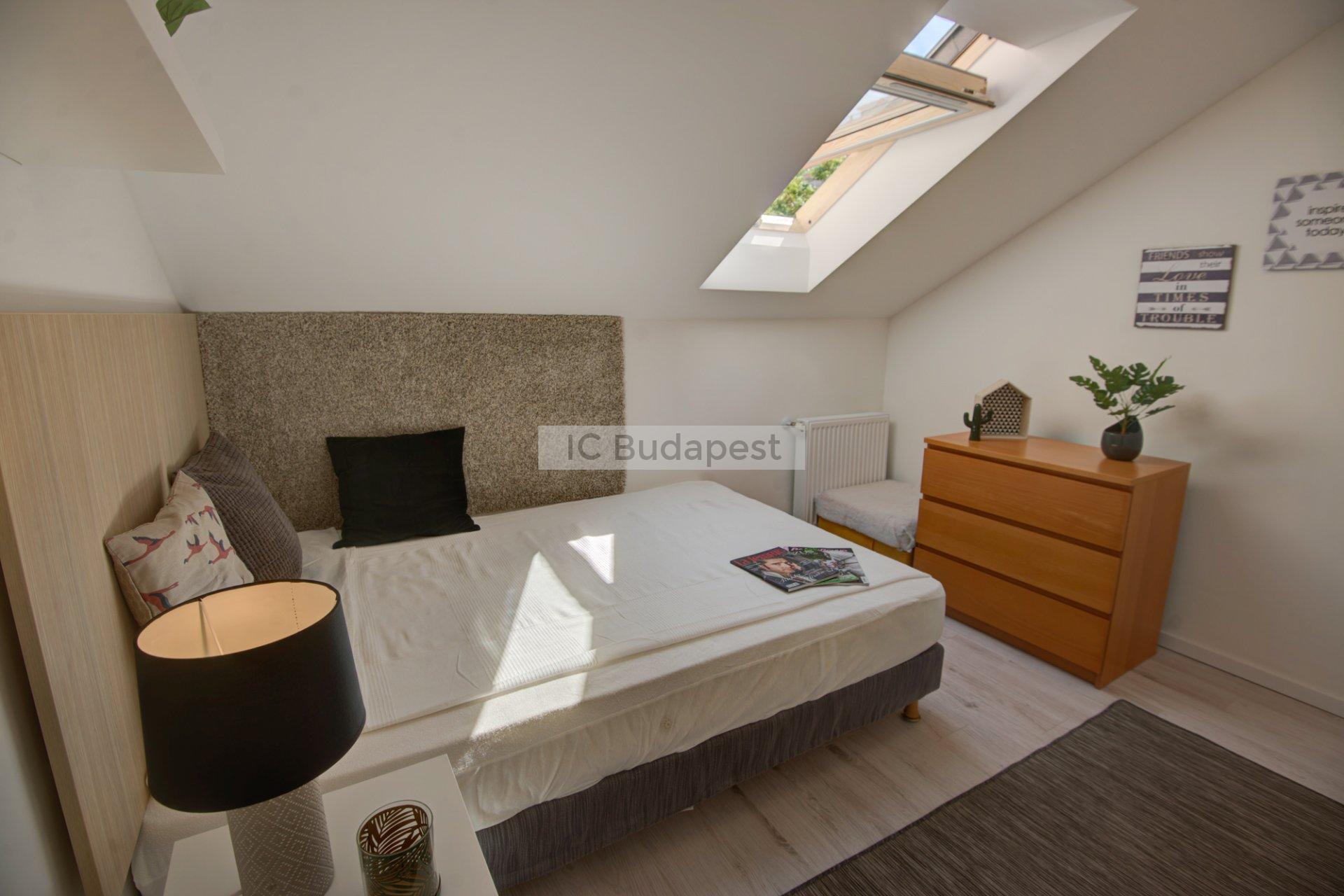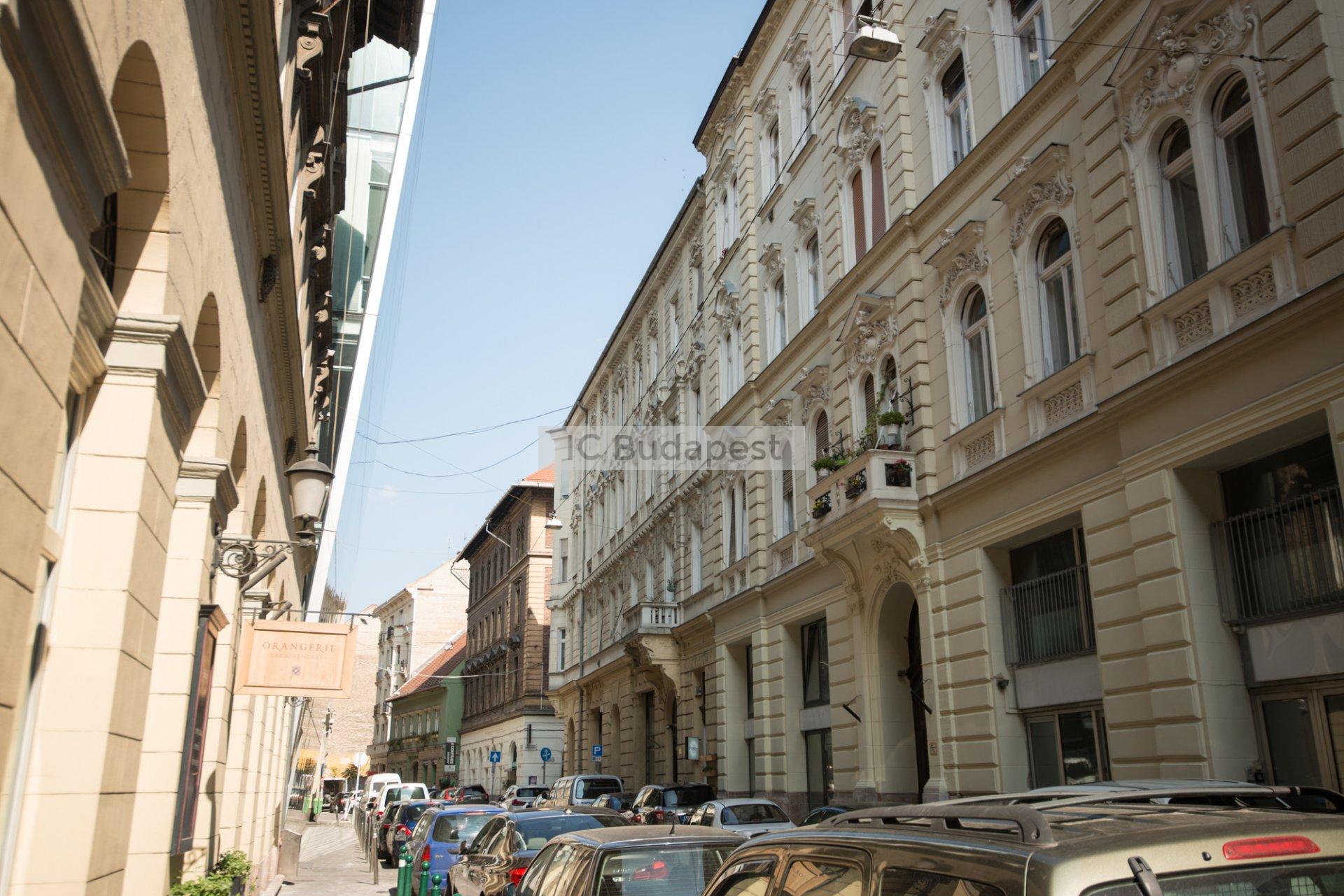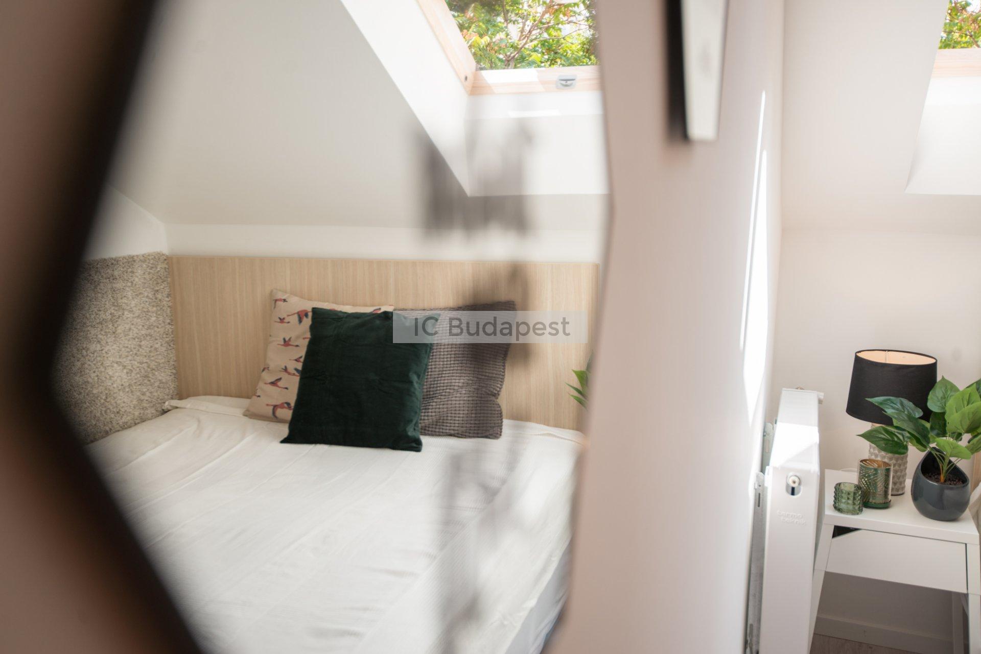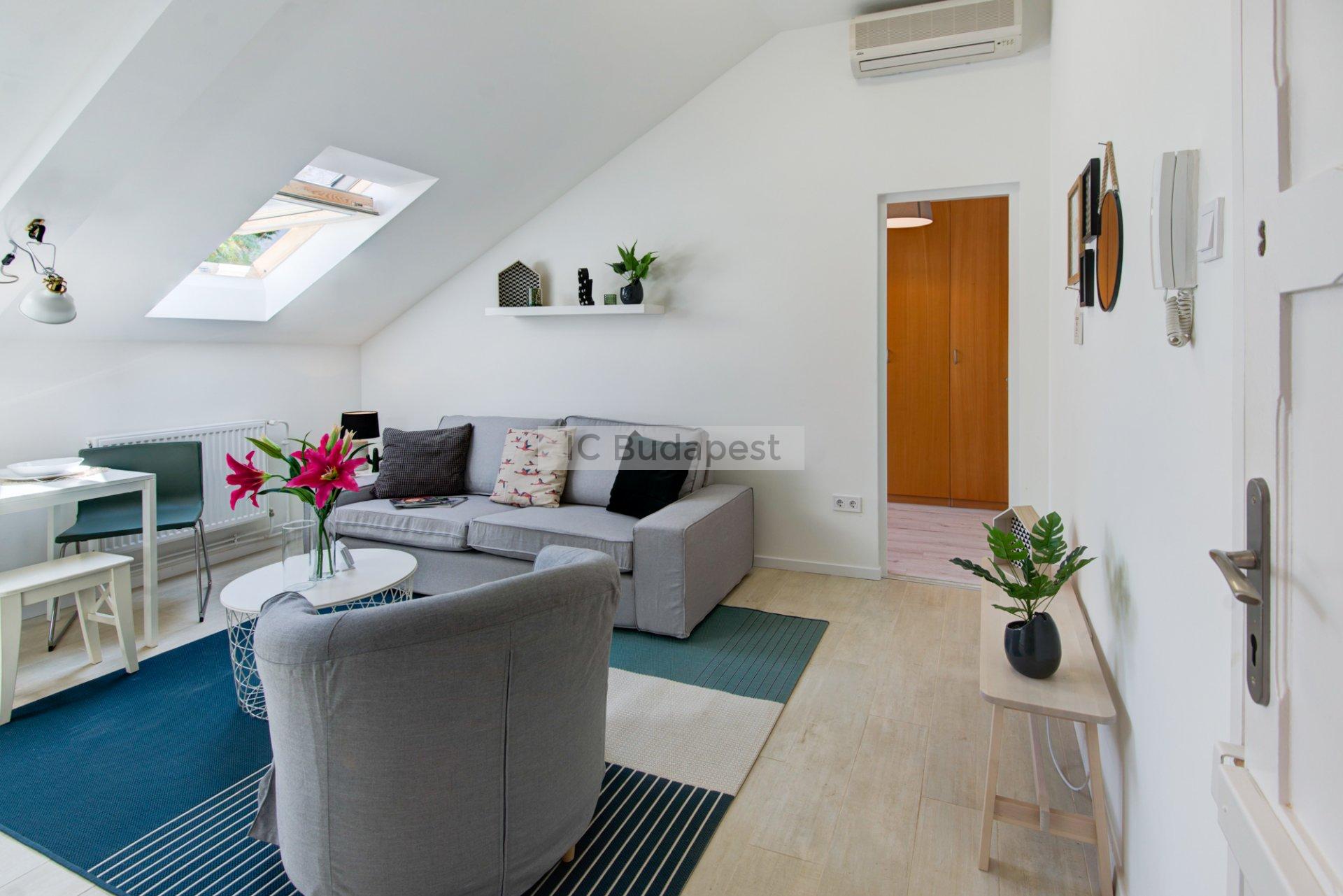 Budapest belvárosában, a Paulay Ede utca Deák tér felőli végén kiadó egy bruttó 52 m2-es, nappali plusz két külön bejáratú hálószobával rendelkező, frissen felújított lakás. A ház rendezett, az ötödik emelet lifttel is elérhető.  A lakás tetőtéri és déli fekvésű, melyeknek köszönhetően nagyon világos. A nyílászárók is ki lettek cserélve a felújítás során, a tetőtéri ablakok fénystoppos árnyékolóval ellátottak. A lakásba belépve az amerikai konyhás nappaliba jutunk, a hálószobák jobbra és balra találhatóak. A nappali jó hangulatú, tágas, világos, kanapéval, étkező asztallal berendezett. A fürdőszoba kádas kialakítású, a mosógép is itt található.
