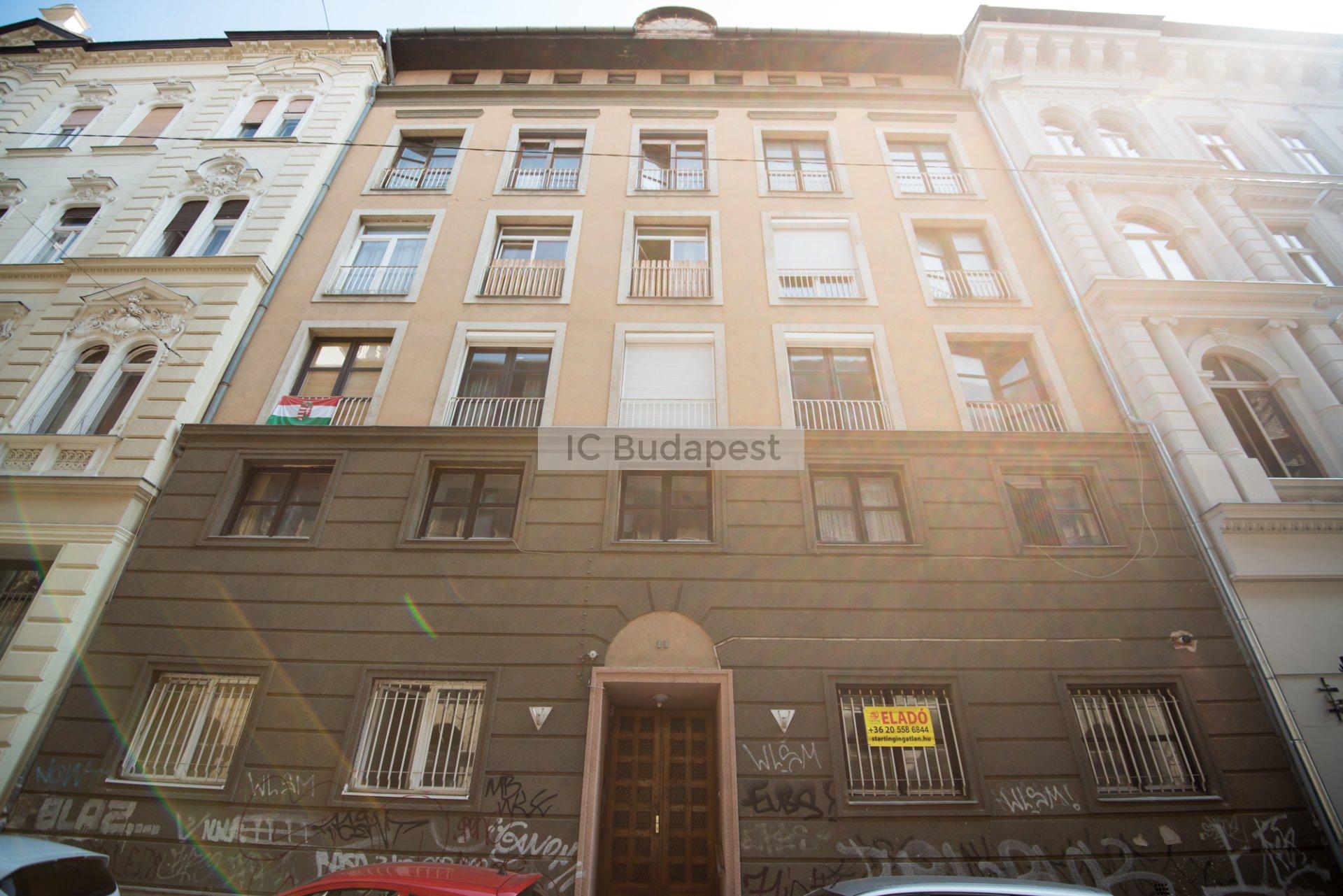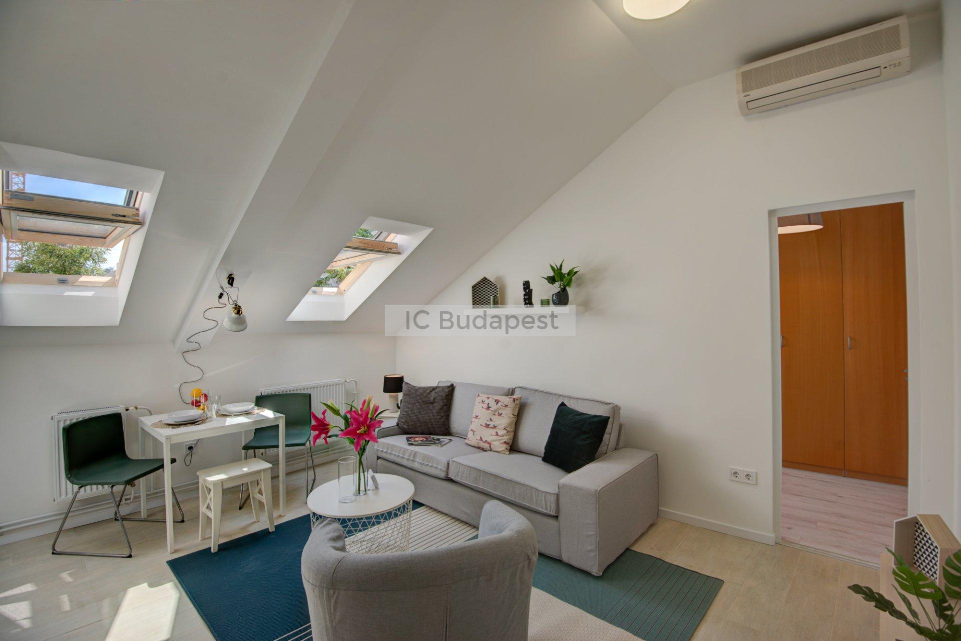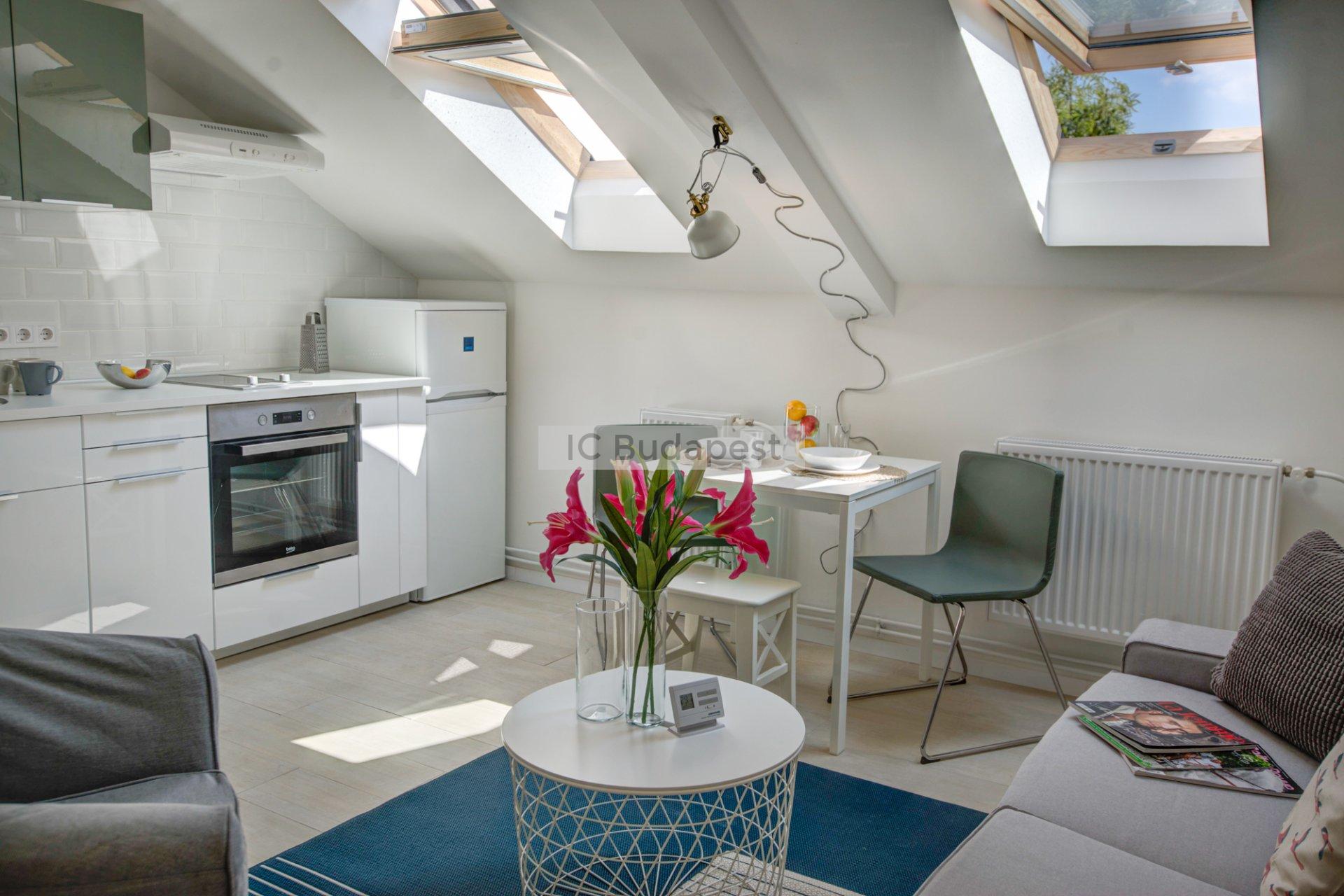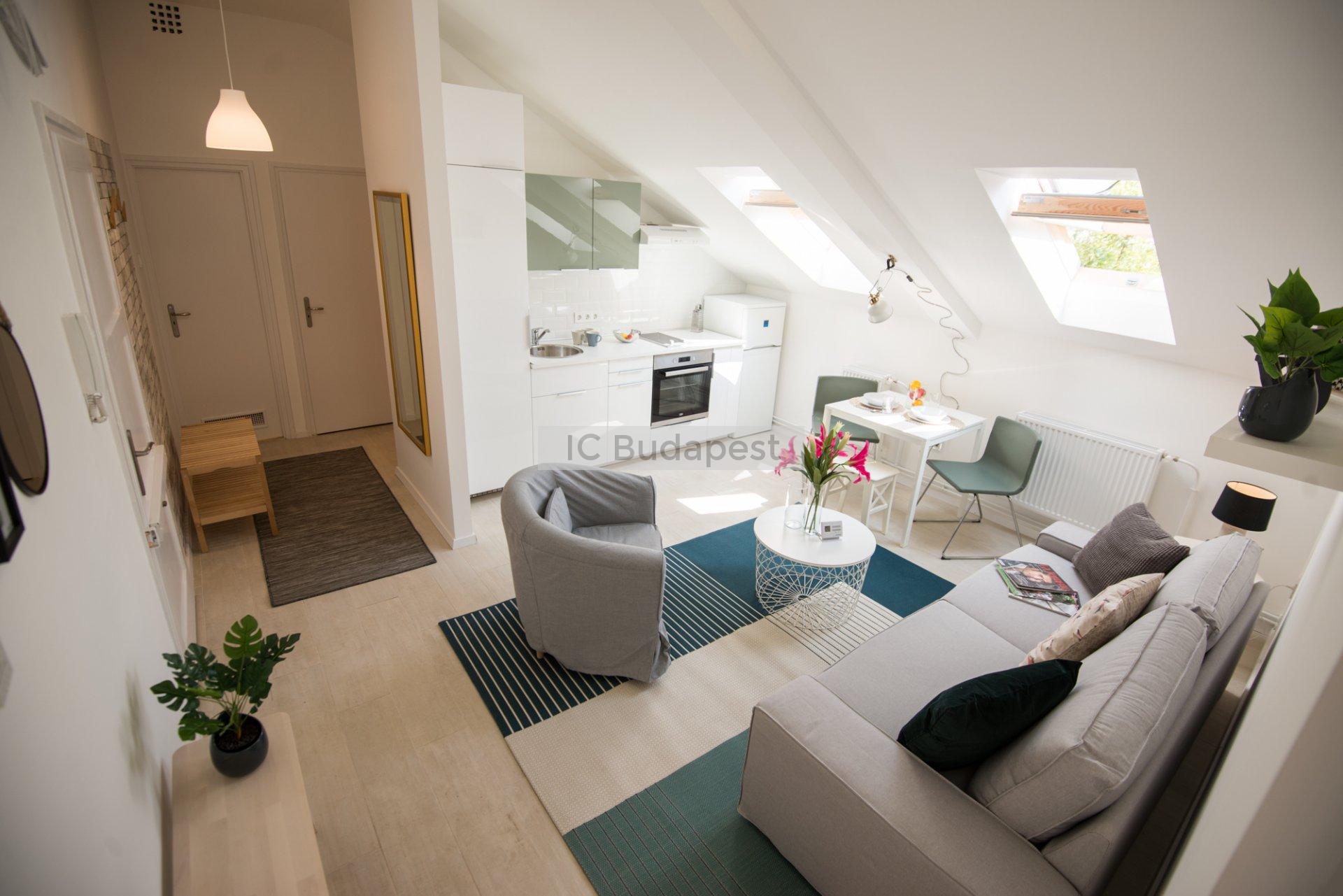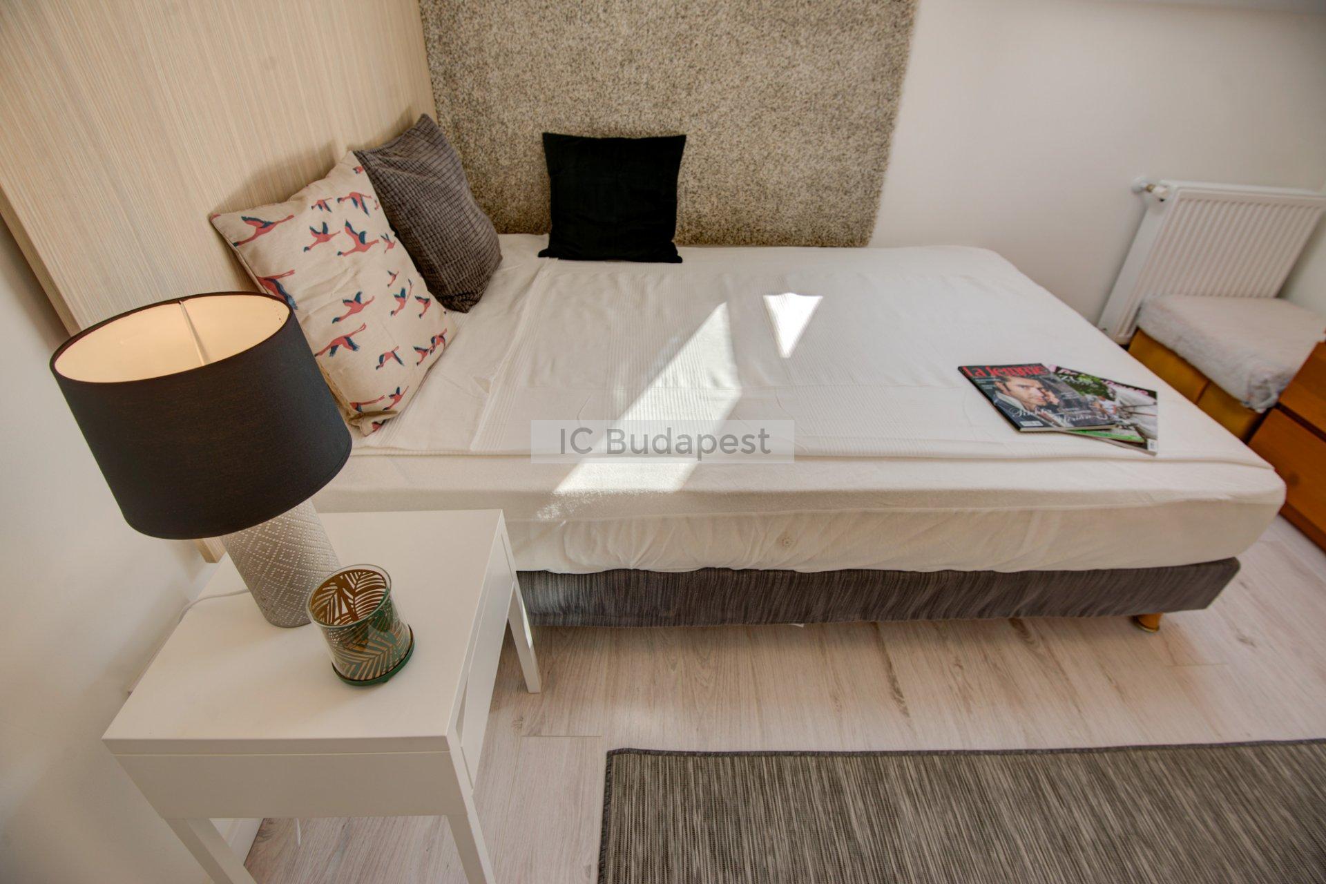 Budapest belvárosában, a Paulay Ede utca Deák tér felőli végén kiadó egy bruttó 52 m2-es, nappali plusz két külön bejáratú hálószobával rendelkező, frissen felújított lakás. A ház rendezett, az ötödik emelet lifttel is elérhető.  A lakás tetőtéri és déli fekvésű, melyeknek köszönhetően nagyon világos. A nyílászárók is ki lettek cserélve a felújítás során, a tetőtéri ablakok fénystoppos árnyékolóval ellátottak. A lakásba belépve az amerikai konyhás nappaliba jutunk, a hálószobák jobbra és balra találhatóak. A nappali jó hangulatú, tágas, világos, kanapéval, étkező asztallal berendezett. A fürdőszoba kádas kialakítású, a mosógép is itt található.