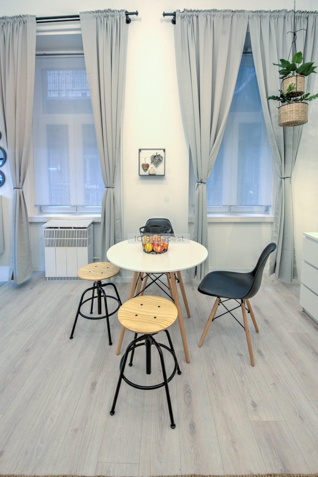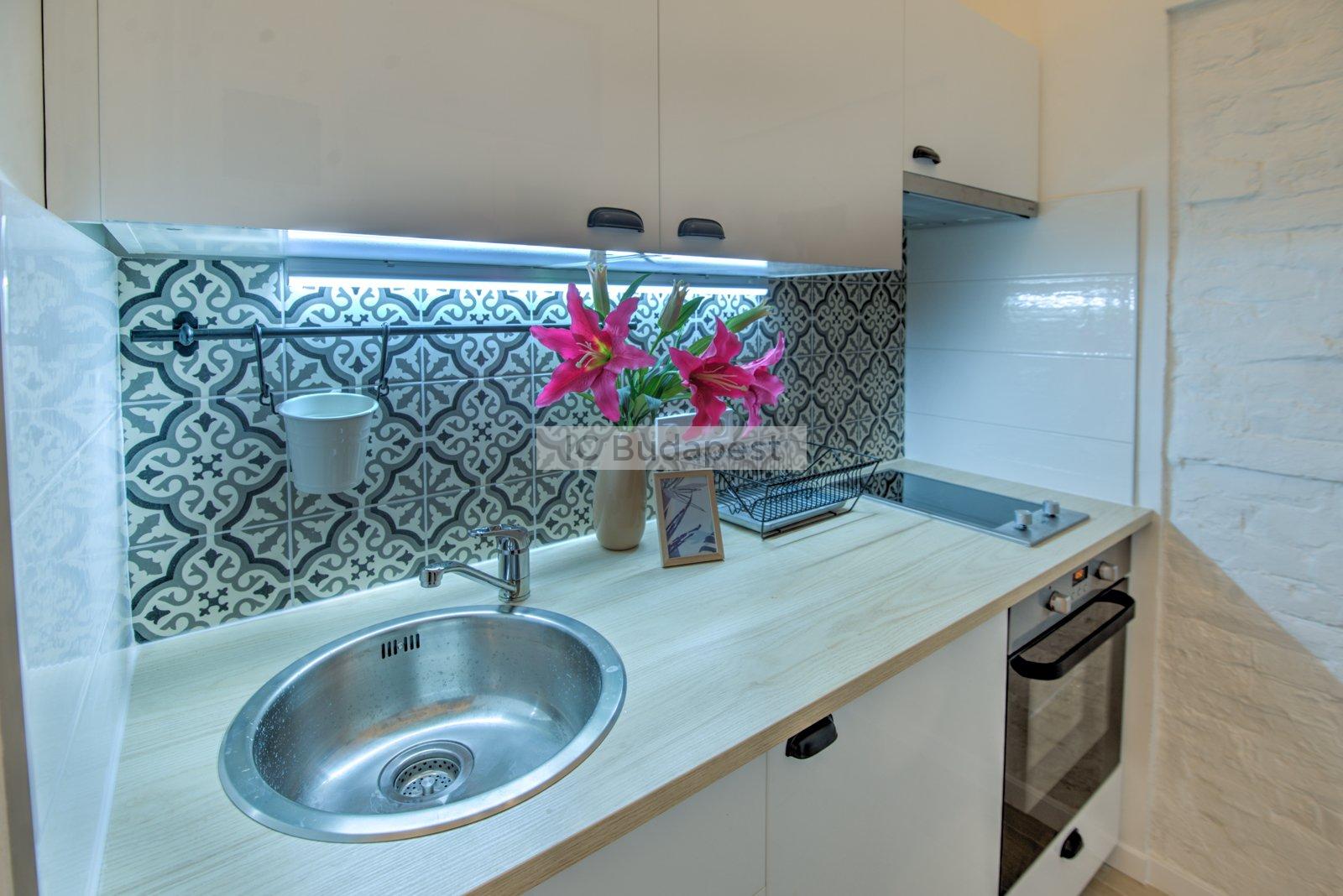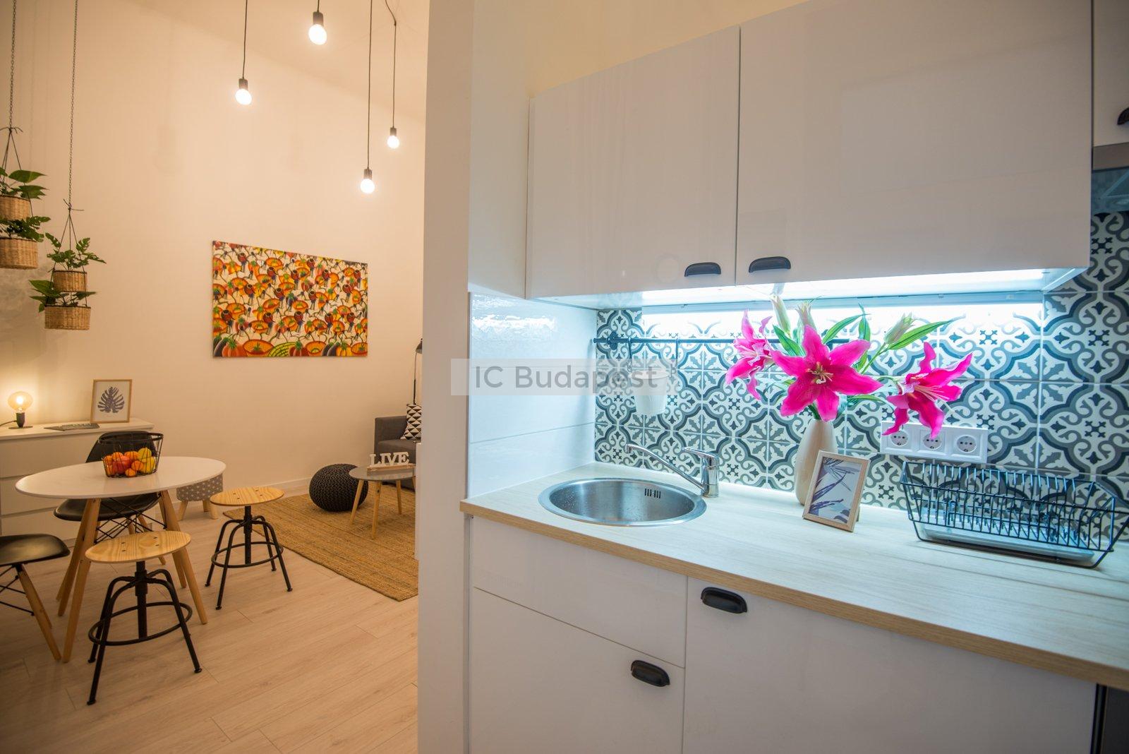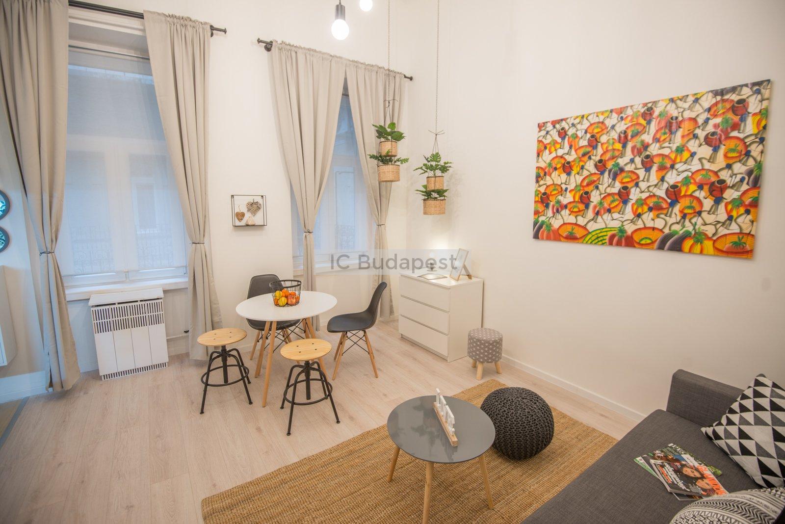 Budapest VI. kerületében, az Andrássy útra merőleges Szinyei Merse Pál utcában, kiváló helyen, közel a Kodály köröndhöz helyezkedik el ez a fiatalosan kialakított lakás. A rendezett társasház 1. emeleti, egy szobás, külön konyhás, teljesen felújított, világos lakása kiválóan alkalmas egyedülállók vagy egy pár kényelmes lakhatására. A lakószoba kinyitható kanapéval berendezett, igényes, fiatalos. A konyha gépesített, a fürdőszoba tusolós, itt található a mosógép is.