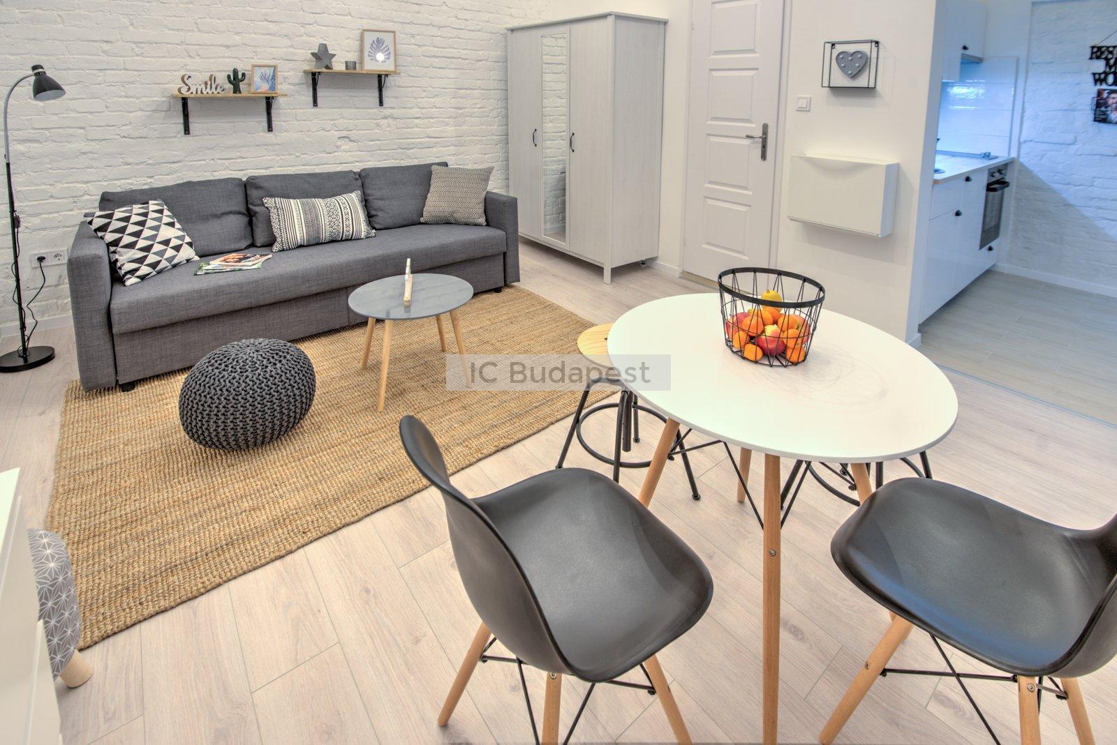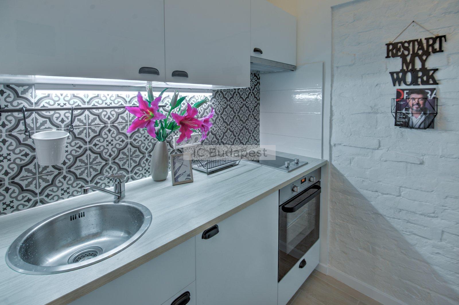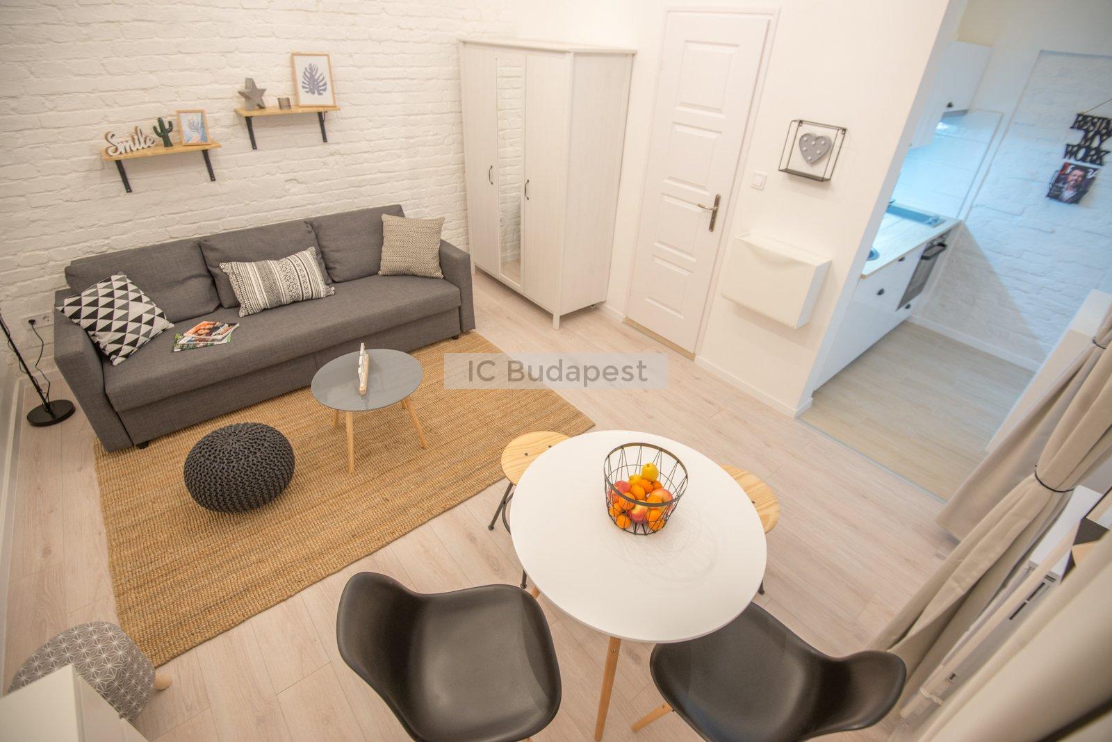 Budapest VI. kerületében, az Andrássy útra merőleges Szinyei Merse Pál utcában, kiváló helyen, közel a Kodály köröndhöz helyezkedik el ez a fiatalosan kialakított lakás. A rendezett társasház 1. emeleti, egy szobás, külön konyhás, teljesen felújított, világos lakása kiválóan alkalmas egyedülállók vagy egy pár kényelmes lakhatására. A lakószoba kinyitható kanapéval berendezett, igényes, fiatalos. A konyha gépesített, a fürdőszoba tusolós, itt található a mosógép is.