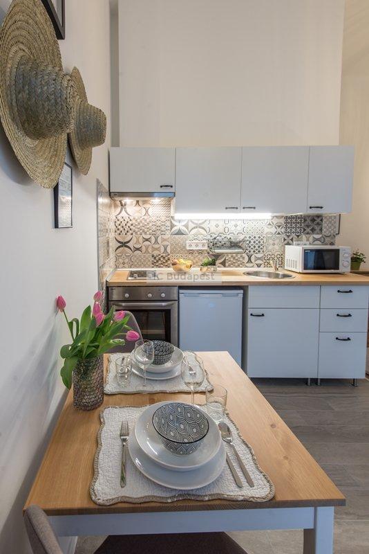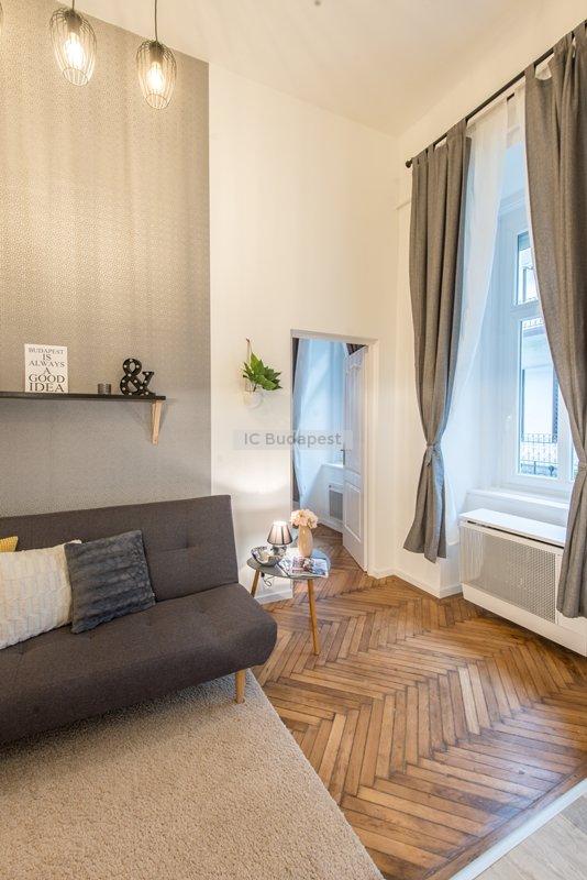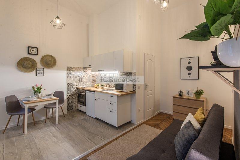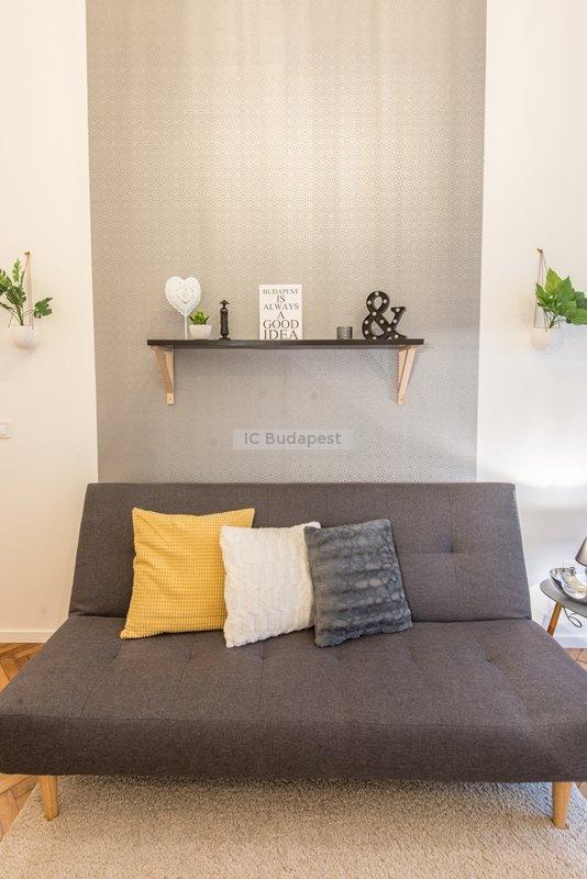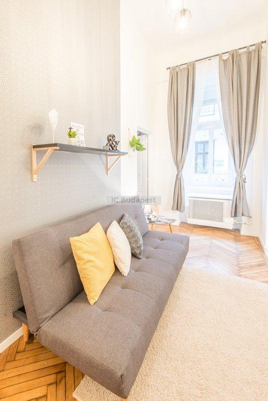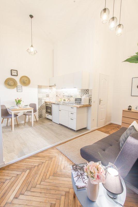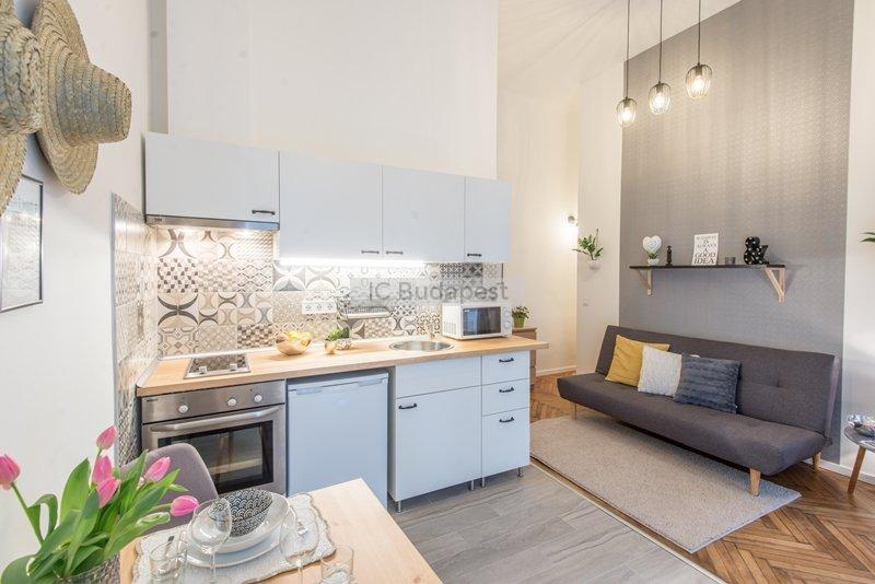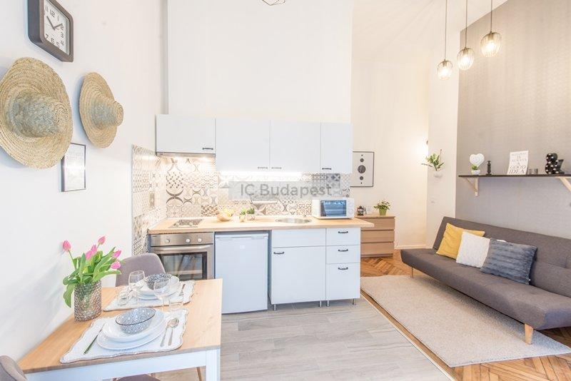 Budapesten, a Vörösmarty utcában, rendezett társasház 1. emeleti, világos, teljesen felújított, igényes, fiatalos lakása kiadó. A lakást a függőfolyosótól tudjuk megközelíteni. A nyílászárói, bejárati ajtaja új, korszerű műanyag, az ablakok redőnyözöttek, fűtése egyedi, burkolatai igényesek, a fürdőszoba tusolós. A konyha egy légtérben van a nappalival, ezenkívül egy hálószoba van. A lakás teljesen felszerelt, a konyhában sütő, főzőlap, hűtőgép szolgálja a kényelmet, a szobában franciaágy van.