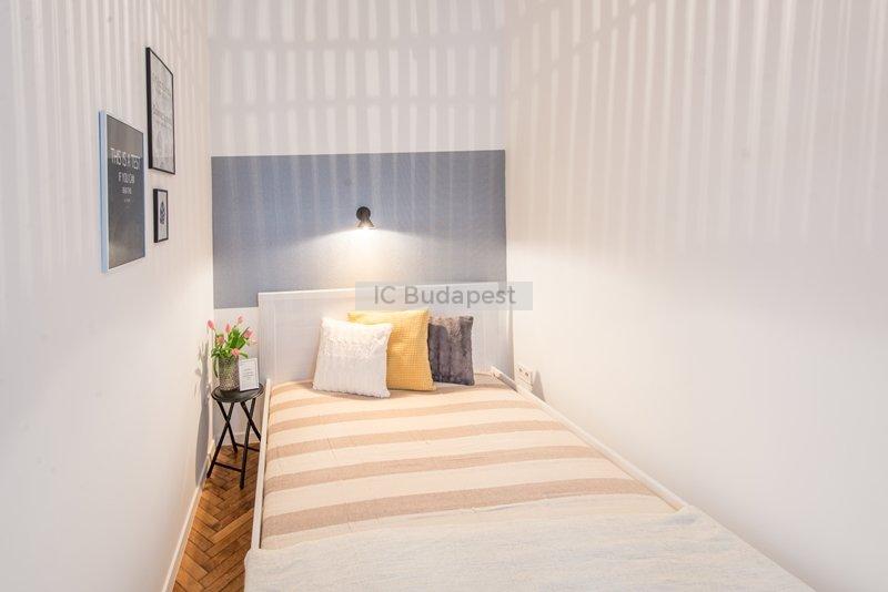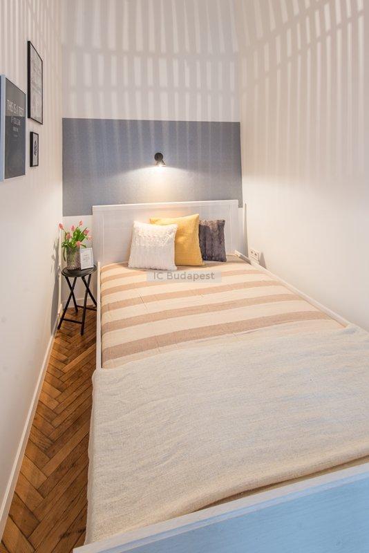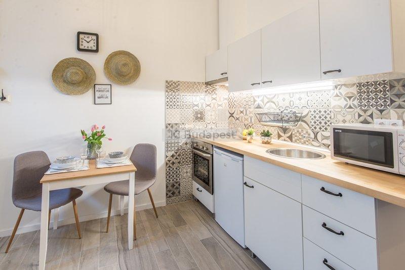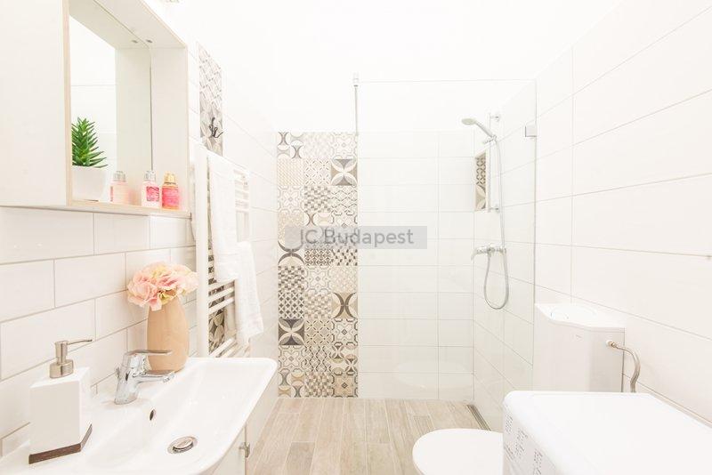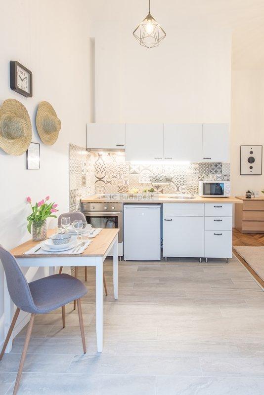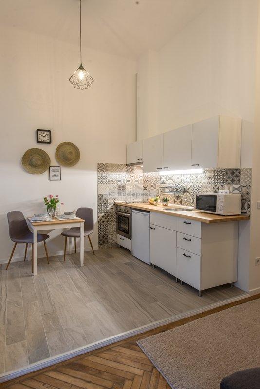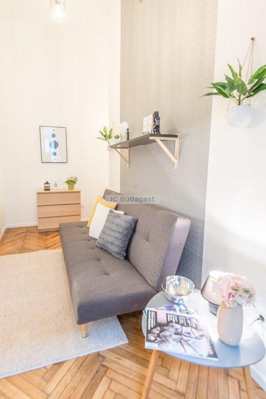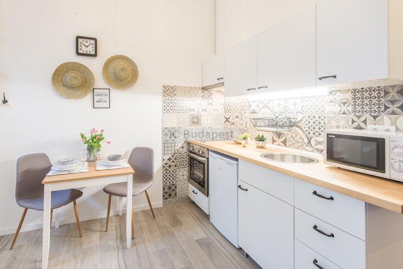 Budapesten, a Vörösmarty utcában, rendezett társasház 1. emeleti, világos, teljesen felújított, igényes, fiatalos lakása kiadó. A lakást a függőfolyosótól tudjuk megközelíteni. A nyílászárói, bejárati ajtaja új, korszerű műanyag, az ablakok redőnyözöttek, fűtése egyedi, burkolatai igényesek, a fürdőszoba tusolós. A konyha egy légtérben van a nappalival, ezenkívül egy hálószoba van. A lakás teljesen felszerelt, a konyhában sütő, főzőlap, hűtőgép szolgálja a kényelmet, a szobában franciaágy van.