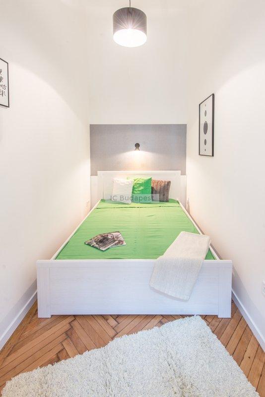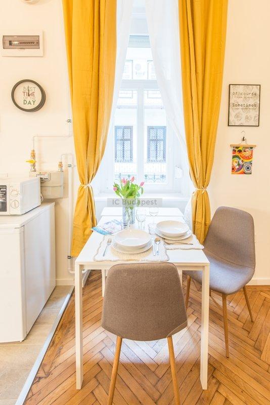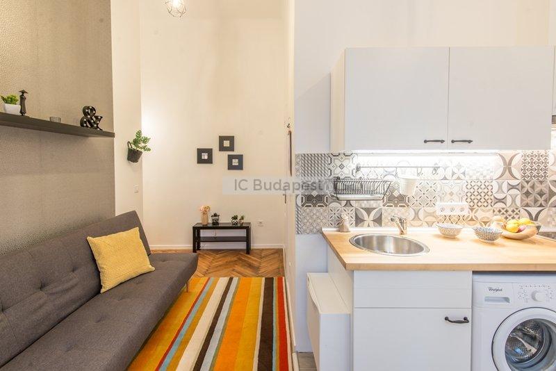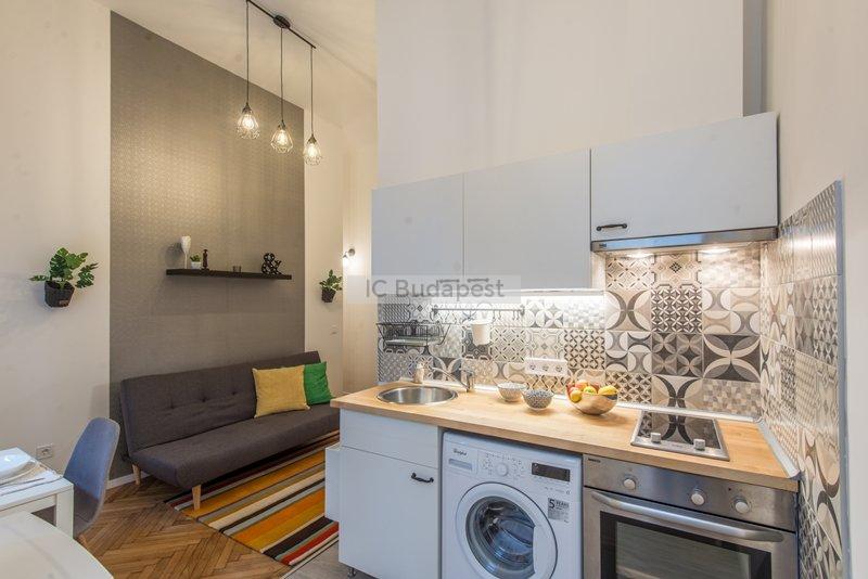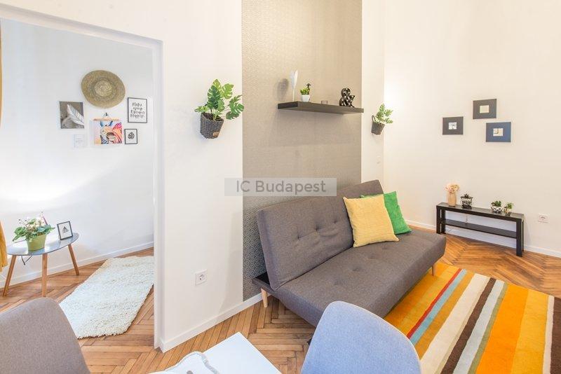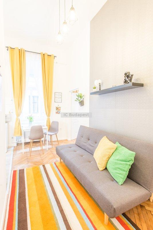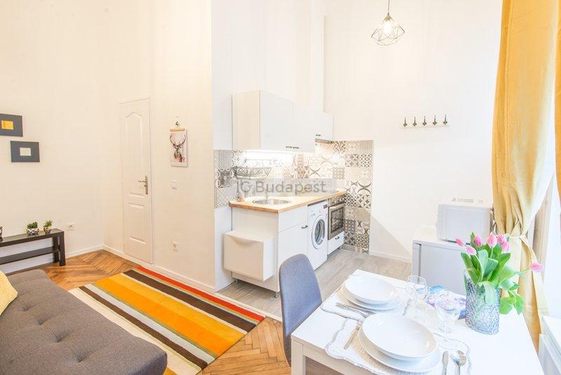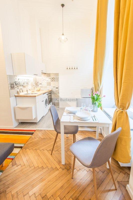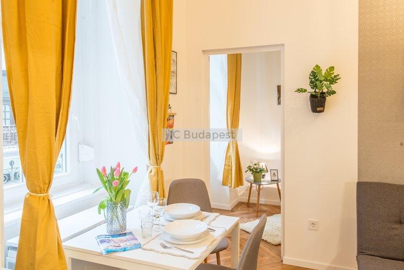 Budapesten, a Vörösmarty utcában, rendezett társasház 1. emeleti, világos, teljesen felújított, igényes, fiatalos lakása kiadó. Fűtése egyedi konvektoros, burkolatai igényesek, a fürdőszoba tusolós. A konyha egy légtérben van a nappalival, ezenkívül egy hálószoba van. A lakás teljesen felszerelt, a konyhában sütő, főzőlap, hűtőgép szolgálja a kényelmet, a szobában franciaágy van. A tárolást gardróbszoba segíti. A lakásban lévő új nyílászárók redőnnyel felszereltek.